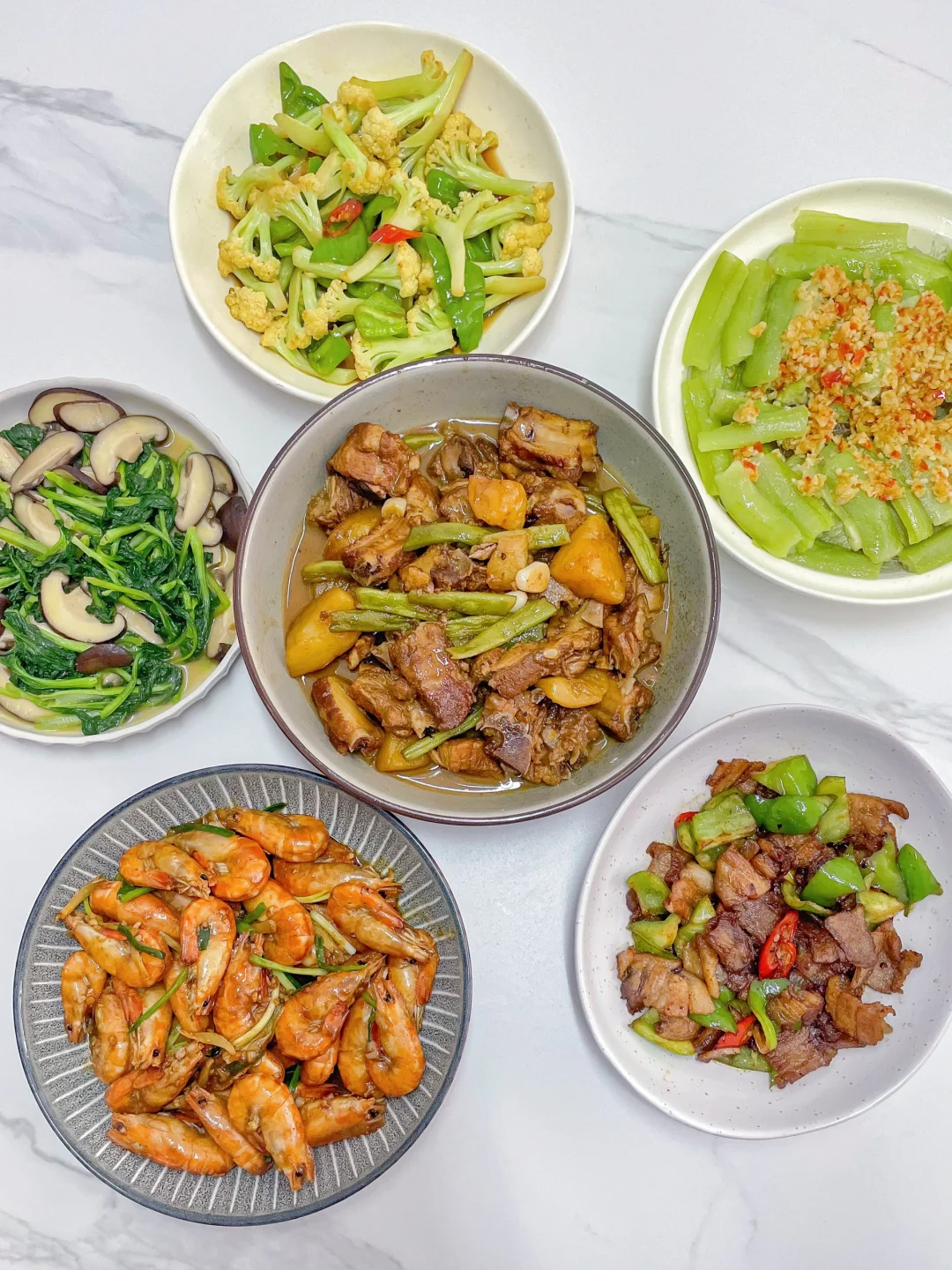 2️⃣排骨土豆炖豆角➕青菜香菇➕干煸花菜➕蒜蓉蒸丝瓜➕芥末罗氏虾➕青椒炒肉