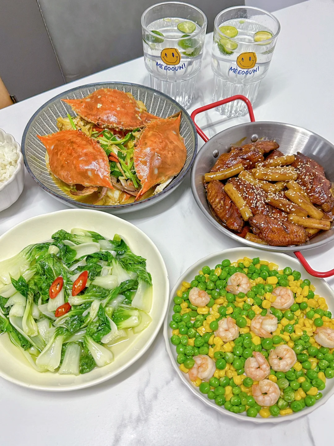 3️⃣葱姜炒梭子蟹➕鸡翅年糕➕虾仁玉米豌豆➕清炒奶白菜