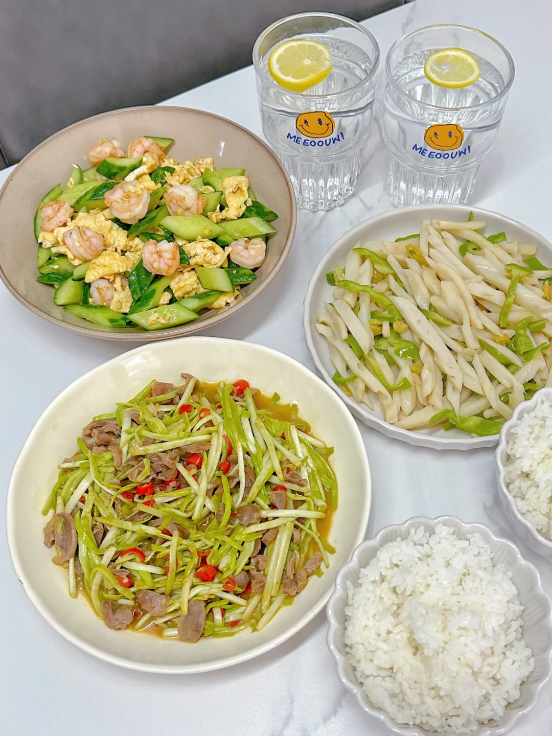 5️⃣韭黄鸡胗➕黄瓜鸡蛋虾仁➕炒藕丝