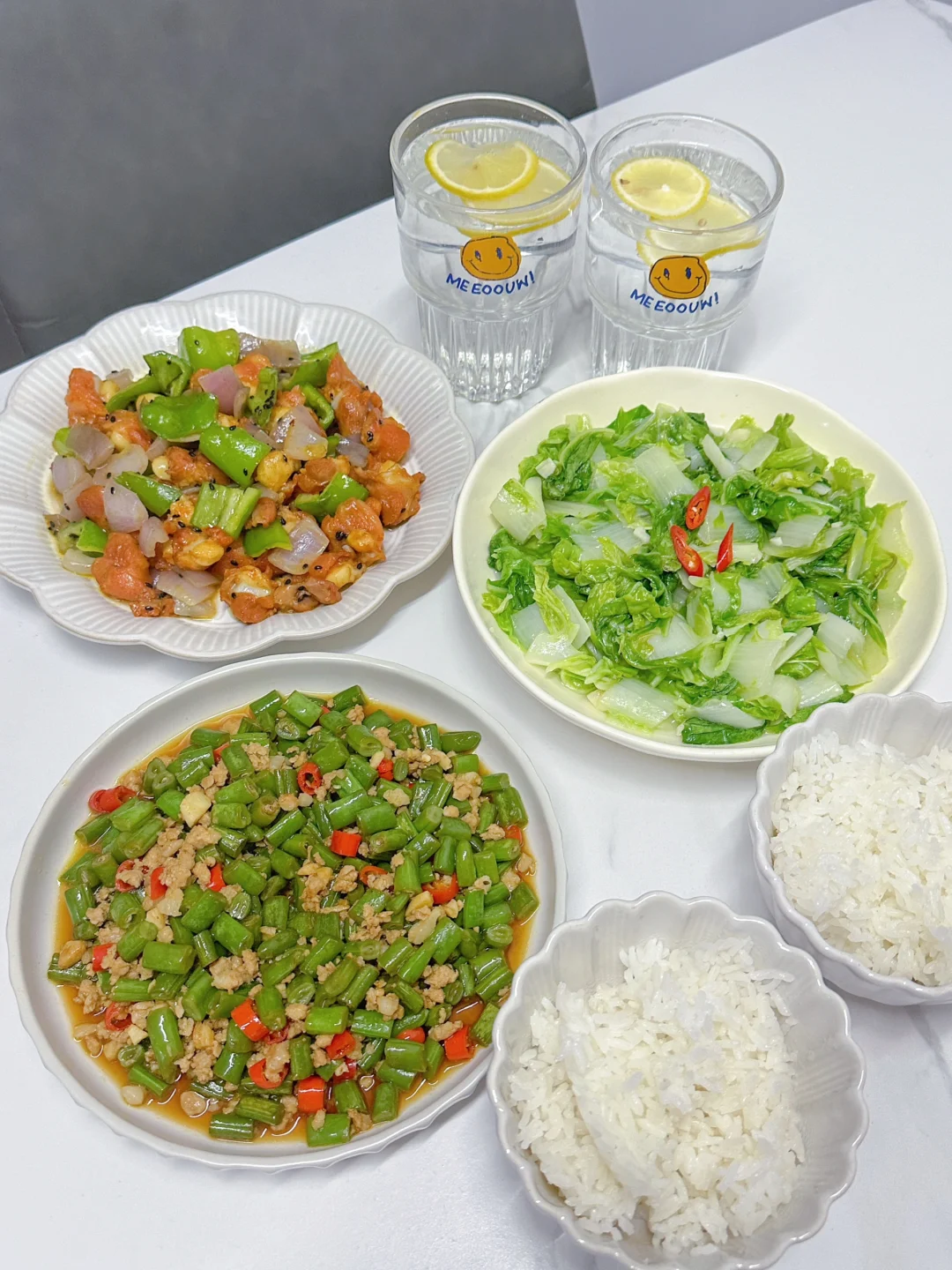 7️⃣肉末豆角➕洋葱掌中宝➕清炒杭白菜