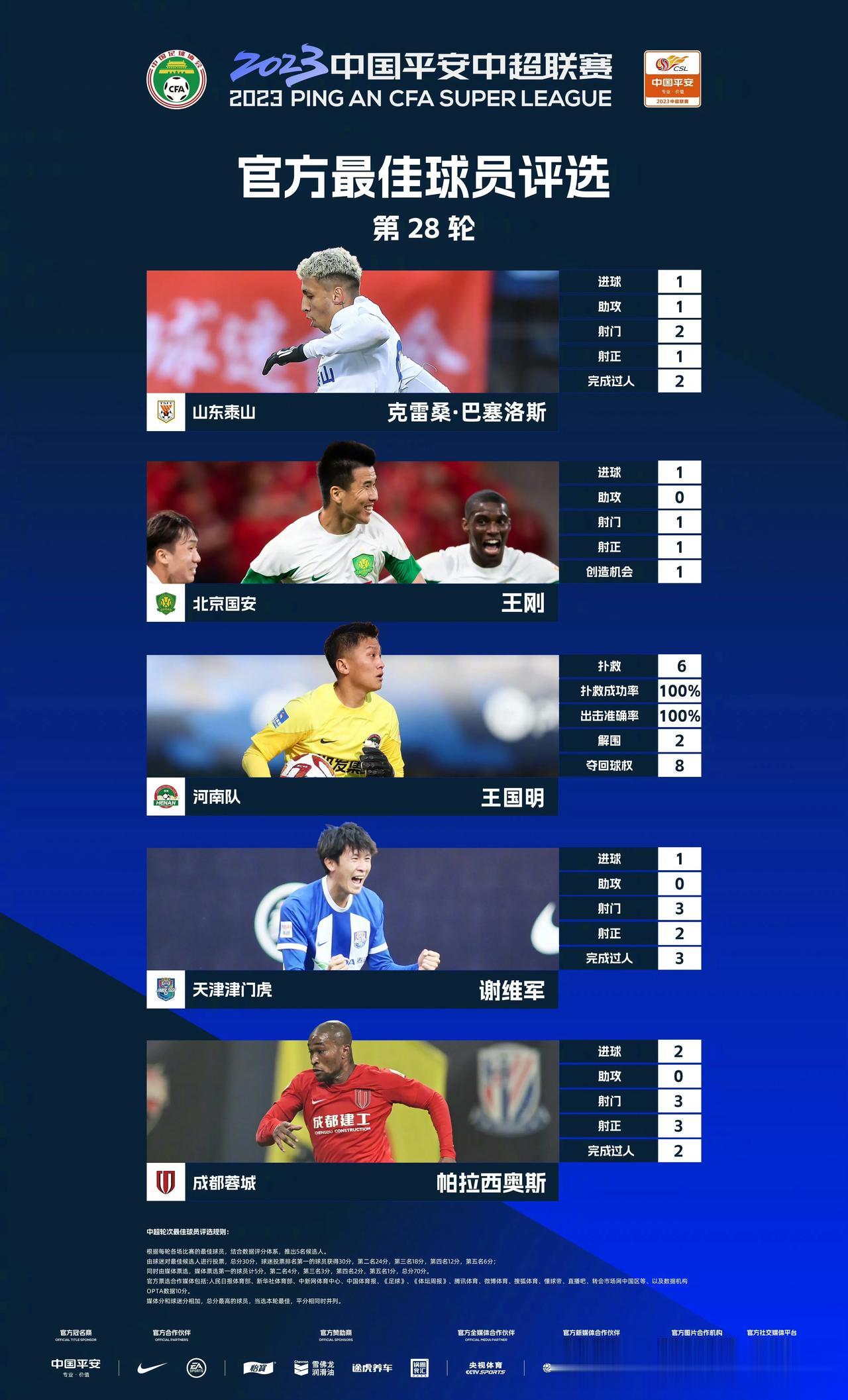 中超联赛第28轮比赛全部结束,官方公布本轮赛果、积分榜和最佳球员评选名单,具体名单如下: 山东泰山队 克雷桑·巴塞洛斯#山东鲁能# 北京国安队王刚 河南队 王国明 天津津门虎队谢维军 成都蓉城队帕拉西奥斯 大家可以去wb为自己喜欢的球员投上一票!#中超#