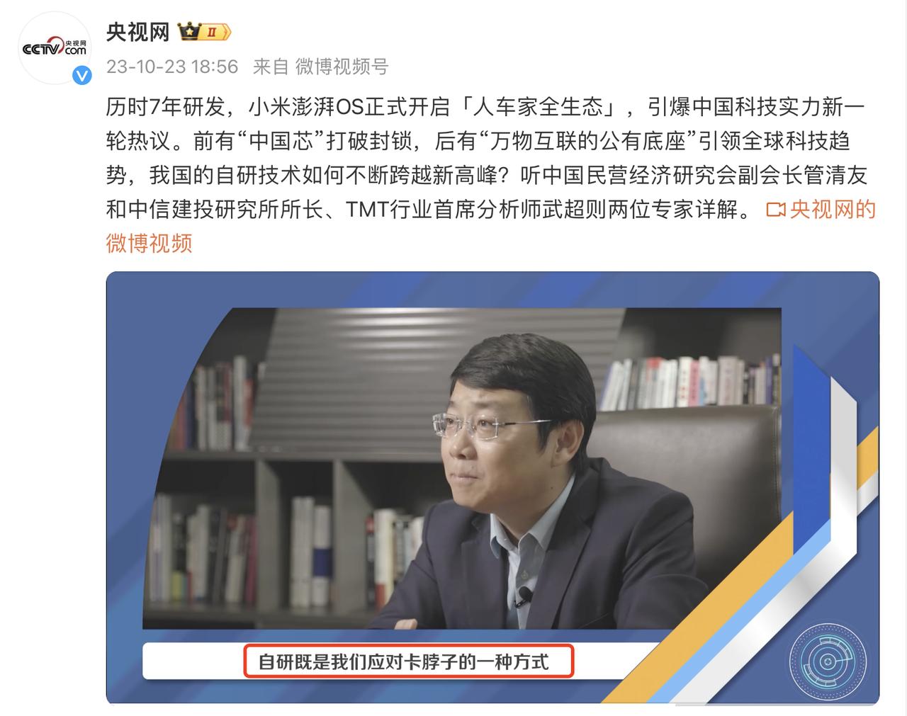 先是华为突破“中国芯”,再有小米“万物互联”OS,央媒定调表扬 小米澎湃OS系统是一款全生态操作系统,历时7年研发。该系统不仅适用于手机,还适用于智能家居和汽车领域,是中国科技发展的基石。小米集团连续入选《财富》世界500强,建立了全球最大的消费级智能物联网平台,拥有强大实力。我们应该不断支持中国科技公司,相信他们会越来越好。
