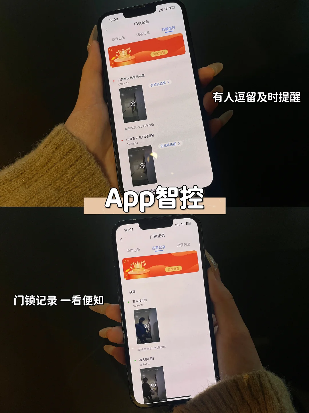 如果有可疑人物在门口逗留会及时提醒,门锁开关的状态也有记录,