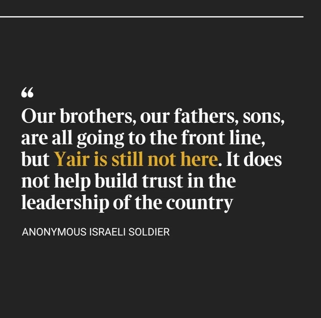 以色列预备役军人问:为什么总理内塔尼亚胡的儿子可以留在美国,而不应召回以色列参加对哈马斯的战斗? 根据英国泰晤士报报道,亚伊尔·内塔尼亚胡是以色列内塔尼亚胡的长子,今年32岁,亚伊尔留在美国不不应召返回以色列参加预备役的事情,在以色列国内引发了很多人的不满。以色列有士兵说:“我们的兄弟,我们的父亲,我们的儿子都要去前线,但亚伊尔仍然不在这里。这无助于建立对国家领导人的信任”。在以色列军队征召了30多万名预备役参加该国历史上最大规模的动员行动后,数百名以色列人从美国返回家园应召入伍。亚伊尔今年早些时候搬到了佛罗里达州并在那里定居。32岁的他有义务参加预备役。一名出于安全原因要求匿名的士兵说:“亚伊尔在迈阿密海滩享受着他的生活,而我在前线”。自愿参加反对哈马斯战争的以色列士兵谴责总理的儿子留在美国并“绑架”他的国家。 备注:以色列人年满18岁时就必须服兵役,男性必须服兵役32个月,女性必须服兵役24个月。退役后他们中的大多数人都可以被征召入以色列预备役部队,直到40岁甚至更老,以防国家发生紧急情况,在战争时期与正规军并肩作战