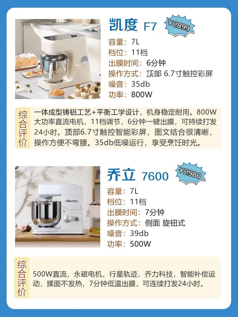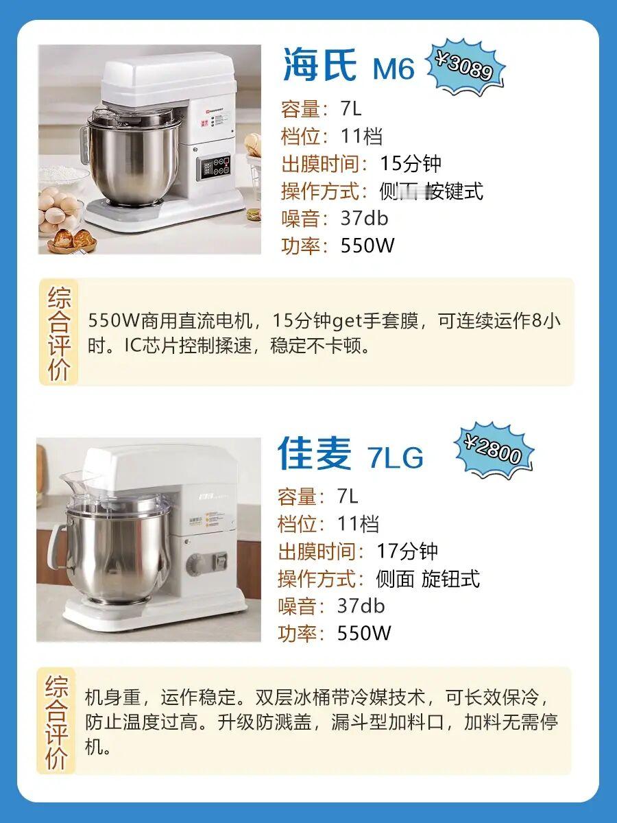 ➡️建议家用偏商用选乔立,揉面量大;喜欢稳重点的选佳麦机身够重;喜欢颜值高的选海氏;家用想要出膜快,操作便捷的,选凯度。