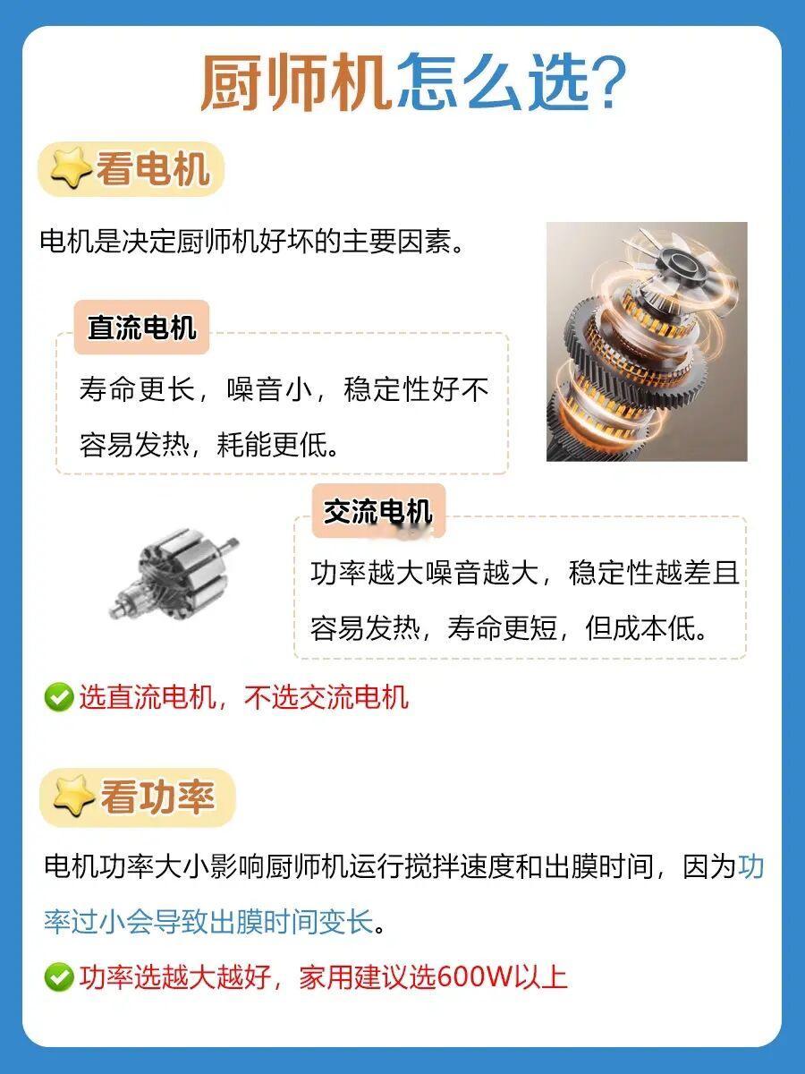 电机功率大小影响厨师机运行搅拌速度和出膜时间,因为功率过小会导致出膜时间变长。