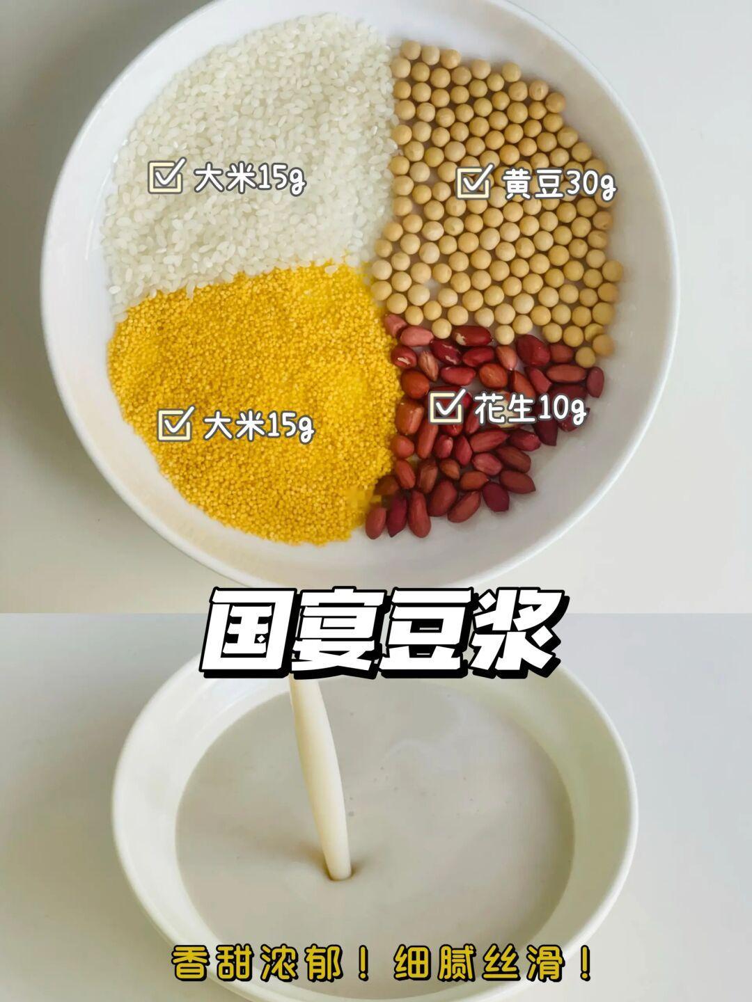 这个国宴豆浆真的太好喝了,不愧央视推荐的,这真的可以经常全家都可以喝,对脾胃比较友好,秋冬的早晨来一杯,真的太棒了,胃暖暖的! 🔆一口沦陷系列! ✅食材: 黄豆➕大米➕小米➕花生 ✅做法: 将清洗好的所有食材放入破壁机中,加适量冰糖➕600mL清水,豆浆模式! ⚠️大家请忽略我的拍照最近太忙,我早饭吃的什么,随意拍,分享给大家,没有时间摆盘[害羞R] 🌈这个豆浆真的好喝,大家可以都喝起来!