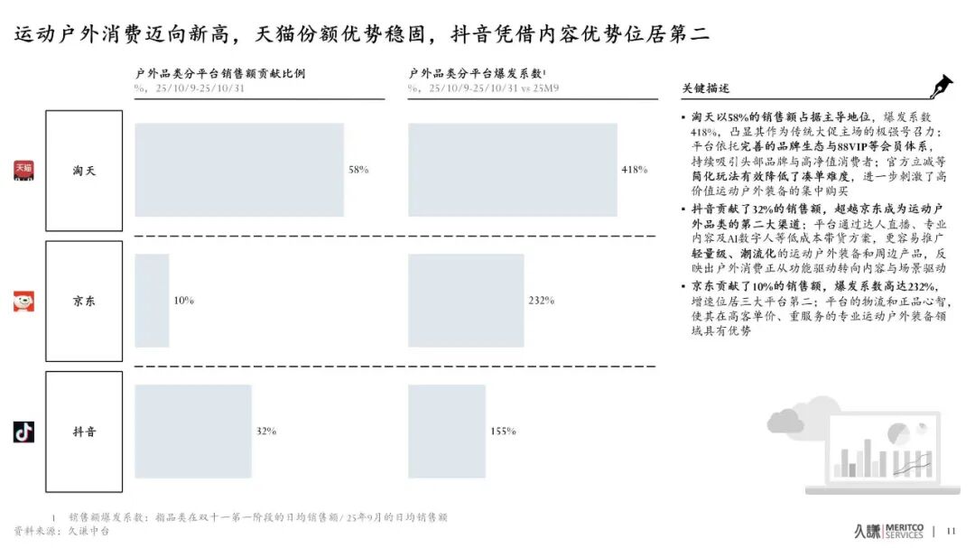 “天猫运动户外销售额占比高达58%,稳居电商平台行业第一。”换言之,运动户外品类主要在天猫的推动下实现爆发。