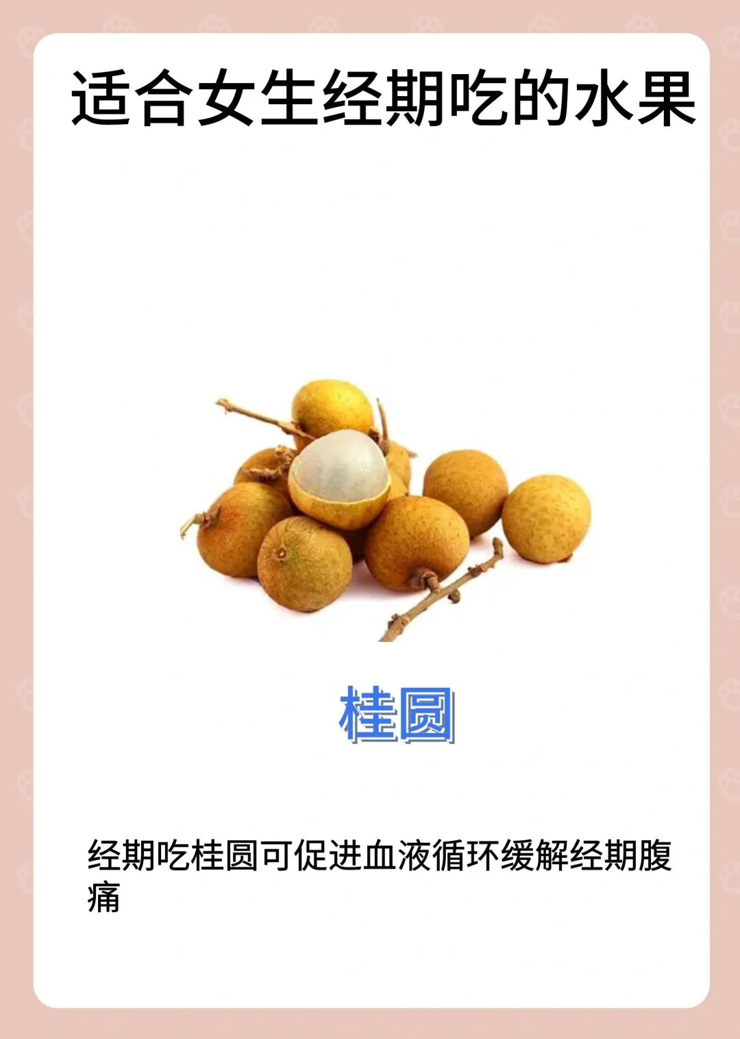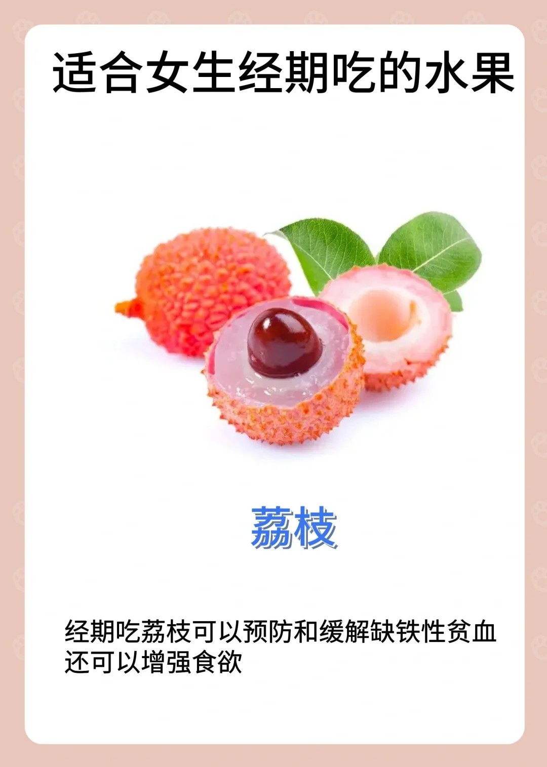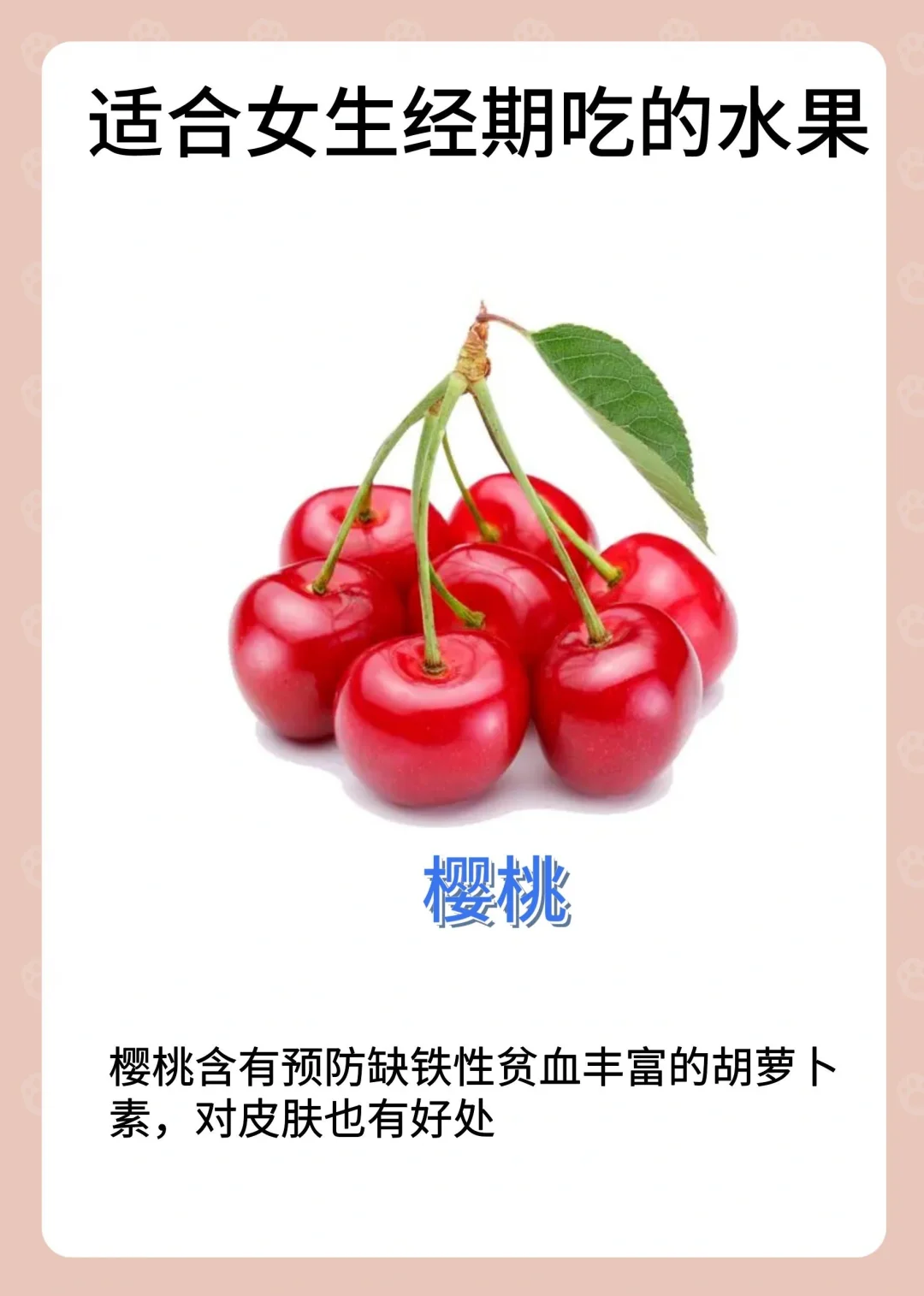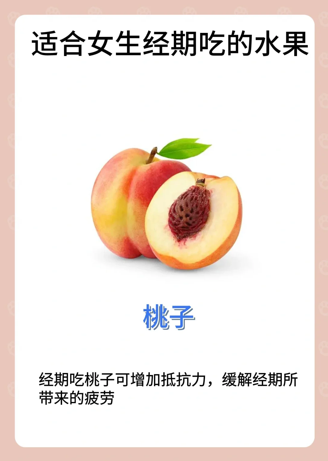 月经可以吃的水果: ✅无花果 ✅橘子 ✅桃子 ✅榴莲 ✅樱桃 ✅桂圆 ✅荔枝 ✅圣女果