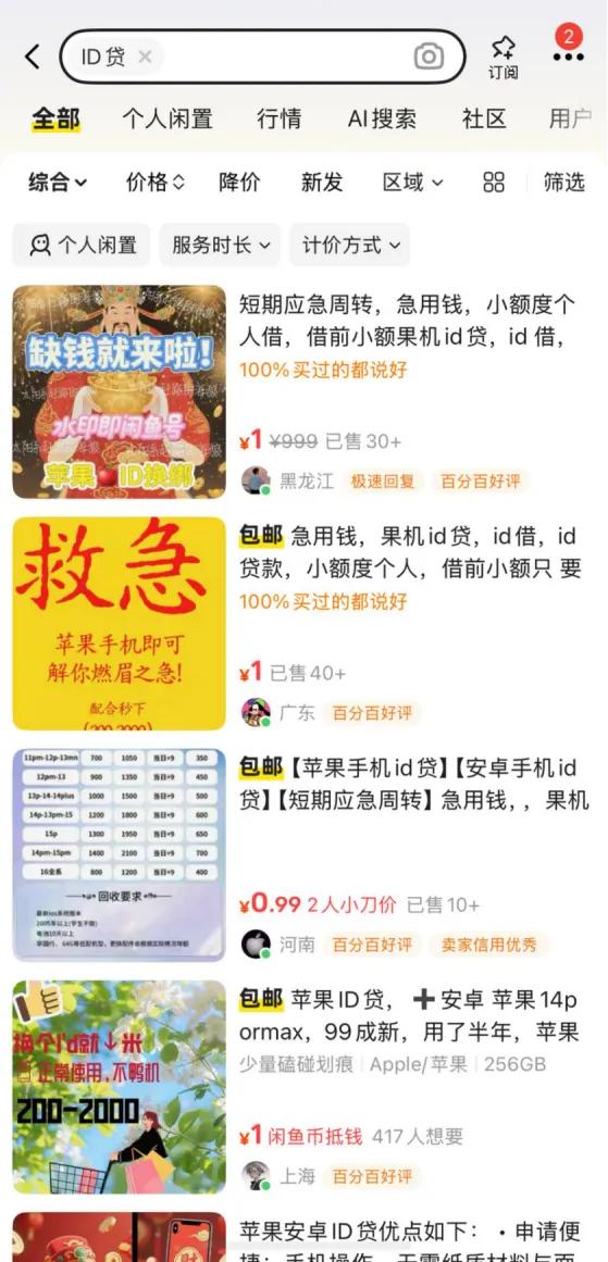调查发现,在闲鱼平台内搜索“ID贷”关键词,大量相关帖子以“苹果ID贷”“安卓ID贷”“短期应急周转”“闪电下款”等名义出现,声称“无需抵押、手机操作、极速到账”,实质上形成一套以高息放贷为特征的灰色借贷体系。
