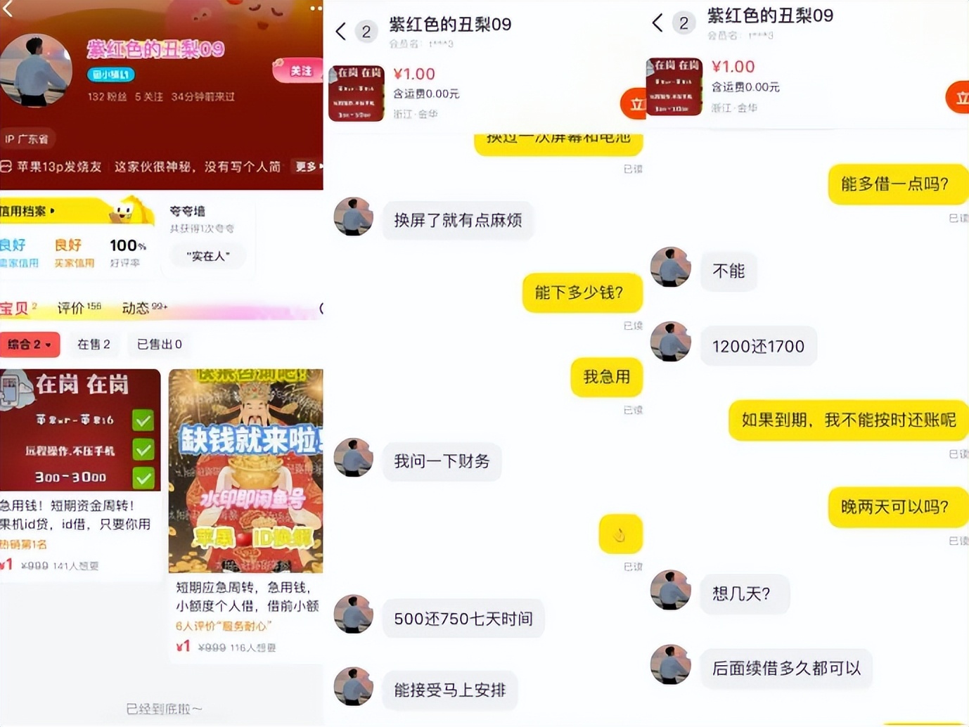 随机联系一位昵称为“出云数码”的闲鱼用户,对方公开表示:“苹果16全款可以借1000元,七天后还款1300元;借1300元需还1750元;若借2000元,七天还款为3000元”。即便对方主动提出可补贴100-200元红包以示“利息高”,其实际年化利率依然远超国家允许的36%红线,构成典型高利贷。
