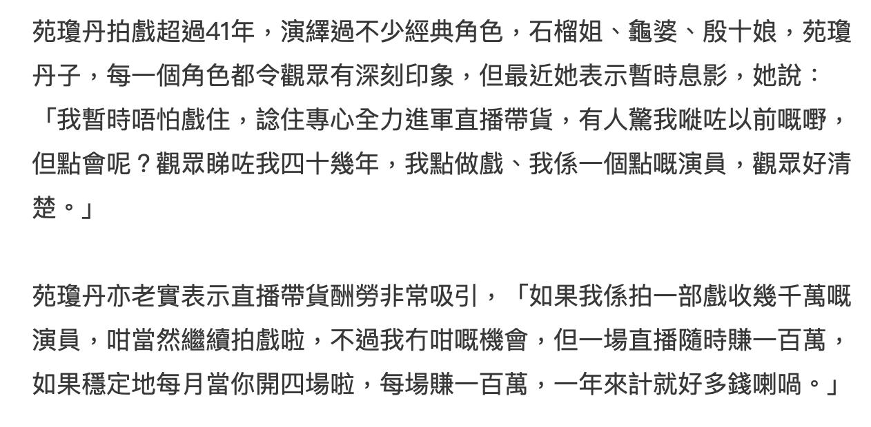 苑琼丹宣布息影主力带货,称做演员没安全感,自曝每场直播赚百万 香港资深演员苑琼丹已经决定息影,未来将以做直播带货为主,因为直播带货更赚钱。她表示做直播带货与演戏有相似之处,都是表演,她需要在短时间内通过表演让观众建立信任感,进而买她卖的产品。虽然息影有些可惜,但她已经在过去呈现了最辉煌的一面,留下了太多的经典,也算是对自己作为演员有了交代。息影只是暂时的,说不定哪天她又会复出。