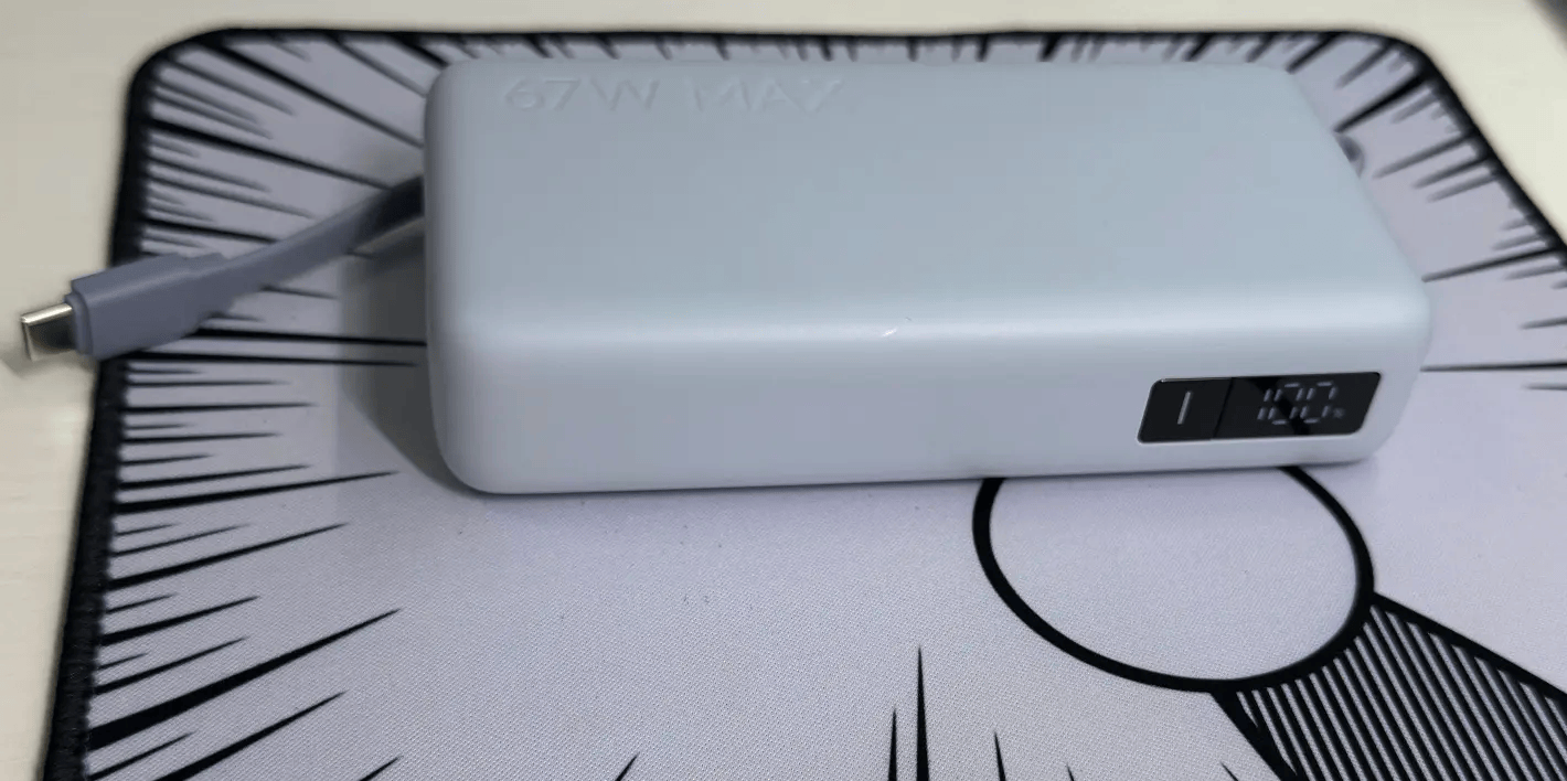 品胜这款主打的是“实用主义”。20000mAh的容量属于中高档配置,外出两三天都不太需要频繁充电。它支持67W快充协议,给手机或平板都很快,笔记本也能救急。自带Type-C线是个加分项,线还能当挂绳用,不过线体偏短,插在远一点的插座上会略不方便。三口输出可以同时充几台设备,适合和朋友或家人一起使用。外壳设计偏厚重,放口袋有点鼓,但胜在稳定可靠。整体属于“功能全、速度稳、便携度一般”的类型。