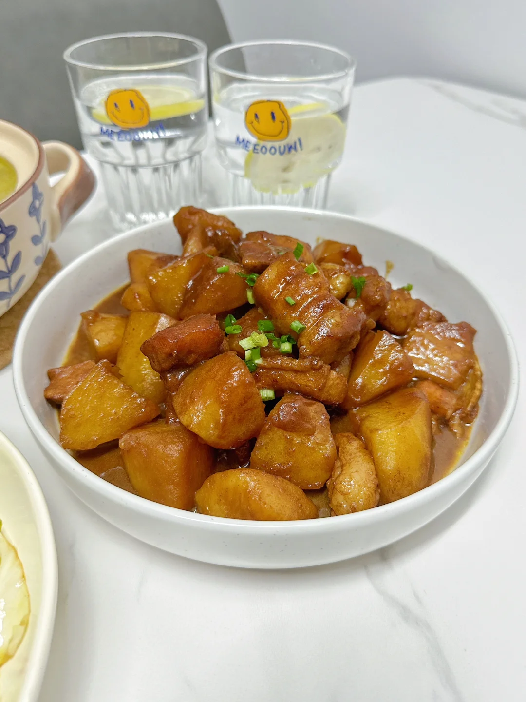 2️⃣倒入适量开水,没过五花肉,炖煮30分钟,放入土豆,继续炖煮10分钟,加入一小勺盐调味,出锅,撒上小葱末,即可