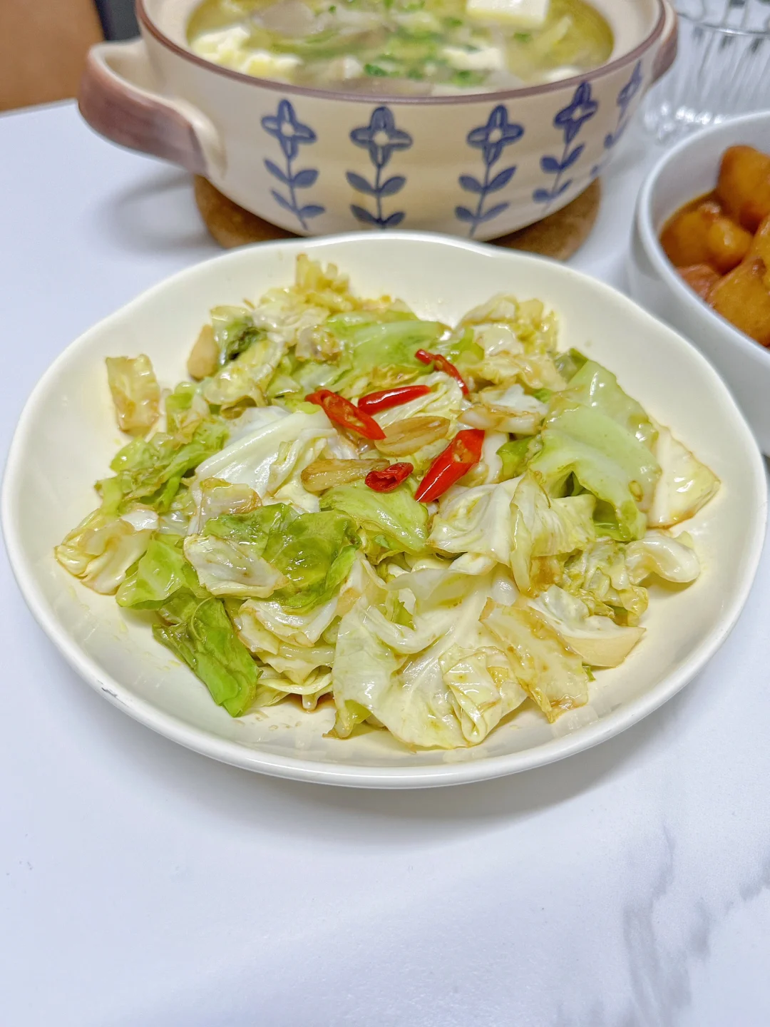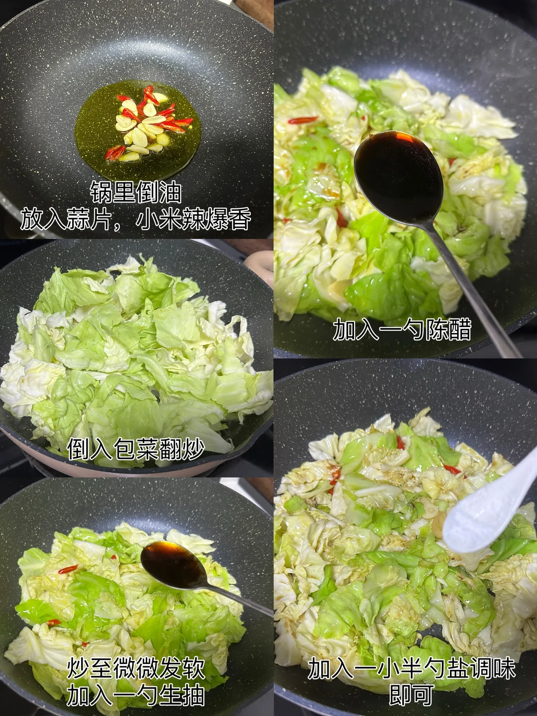 1️⃣锅里倒油,放入小米辣,大蒜爆香,倒入包菜翻炒,炒至微微发软,加入一勺生抽,一勺陈醋,小半勺盐调味,翻炒均匀,即可