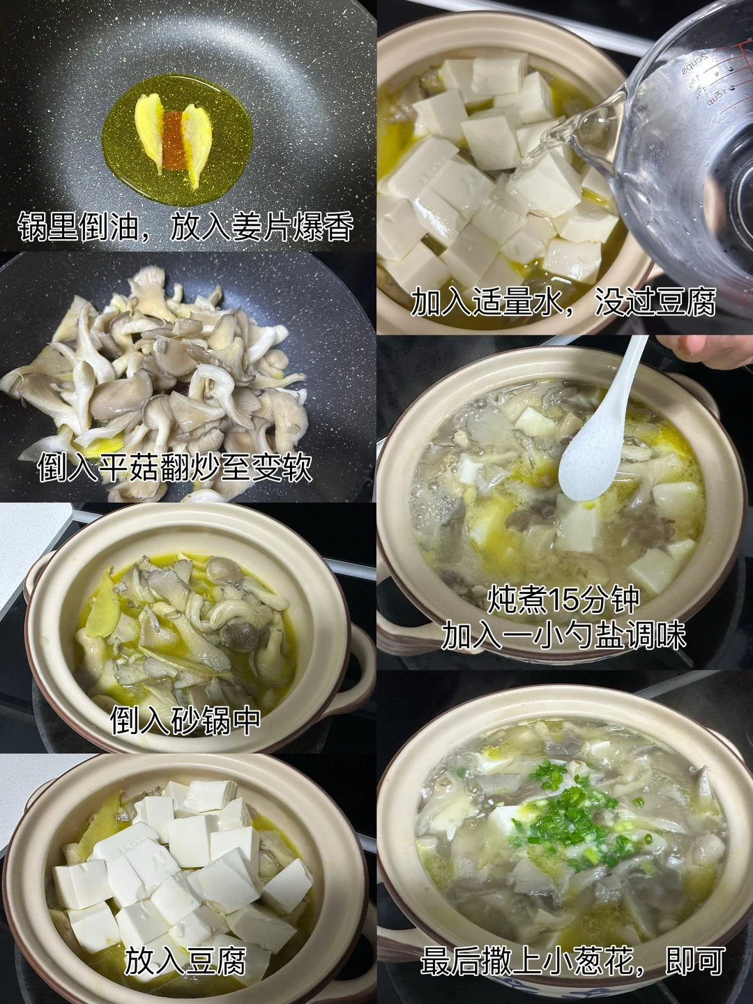 2️⃣将平菇倒入砂锅中,放入豆腐,倒入适量清水没过豆腐,焖煮15分钟,加入一小勺盐调味,撒上小葱末即可