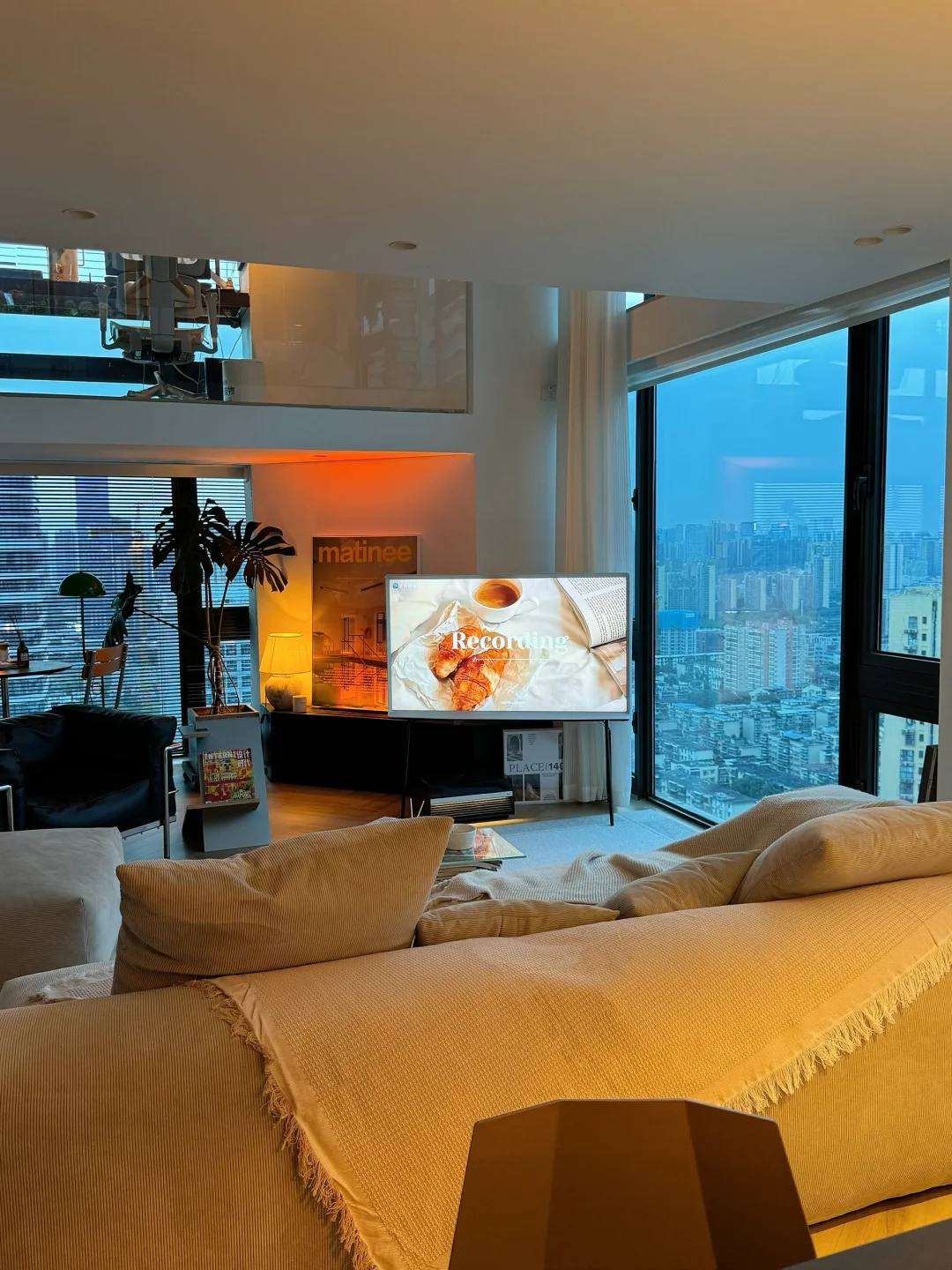 💡软装从刚开始的现代简约变得更加温馨啦!布艺沙发,配上地毯就很家的温馨感。各种落地灯。台灯增加家的氛围感!