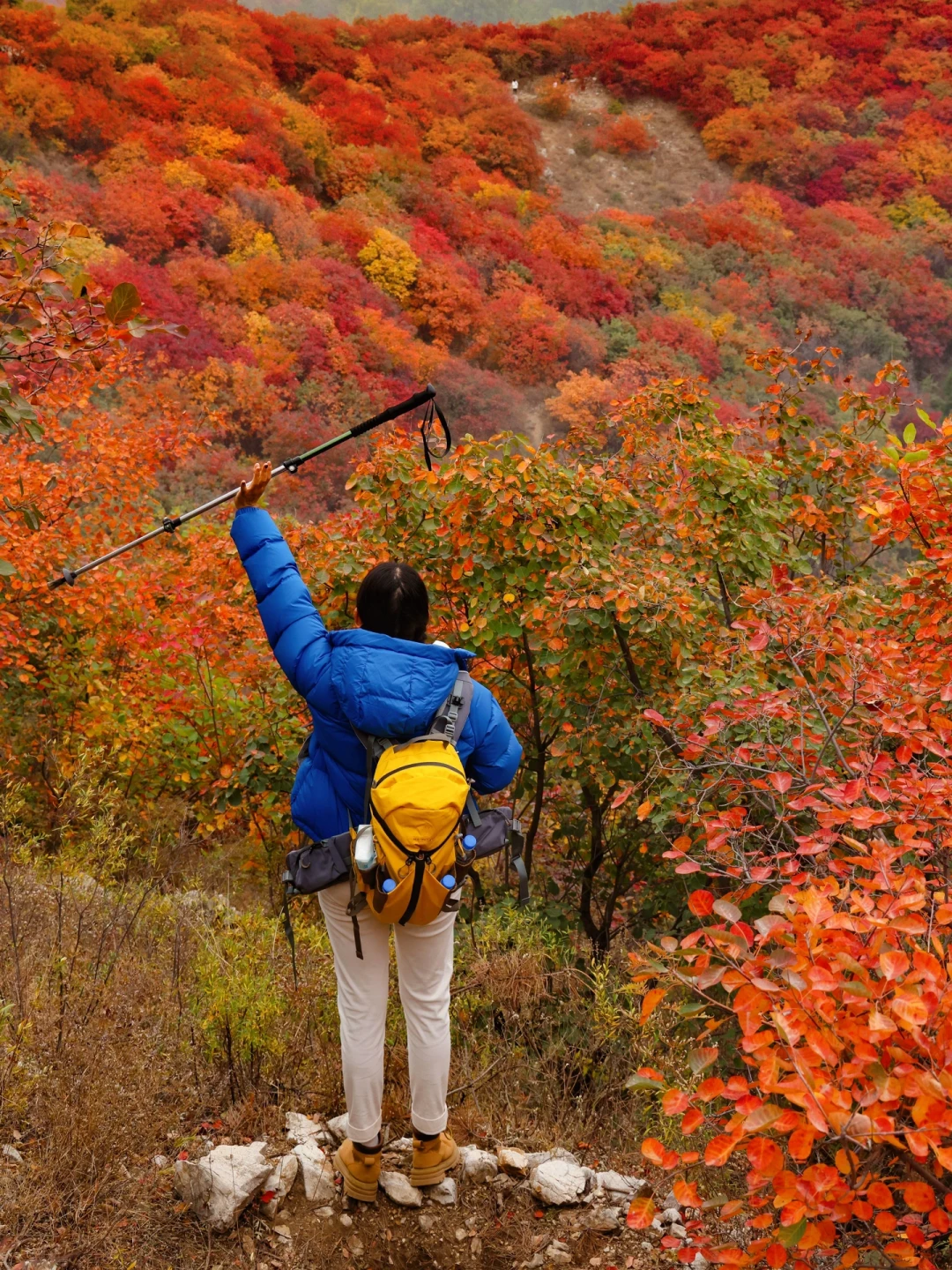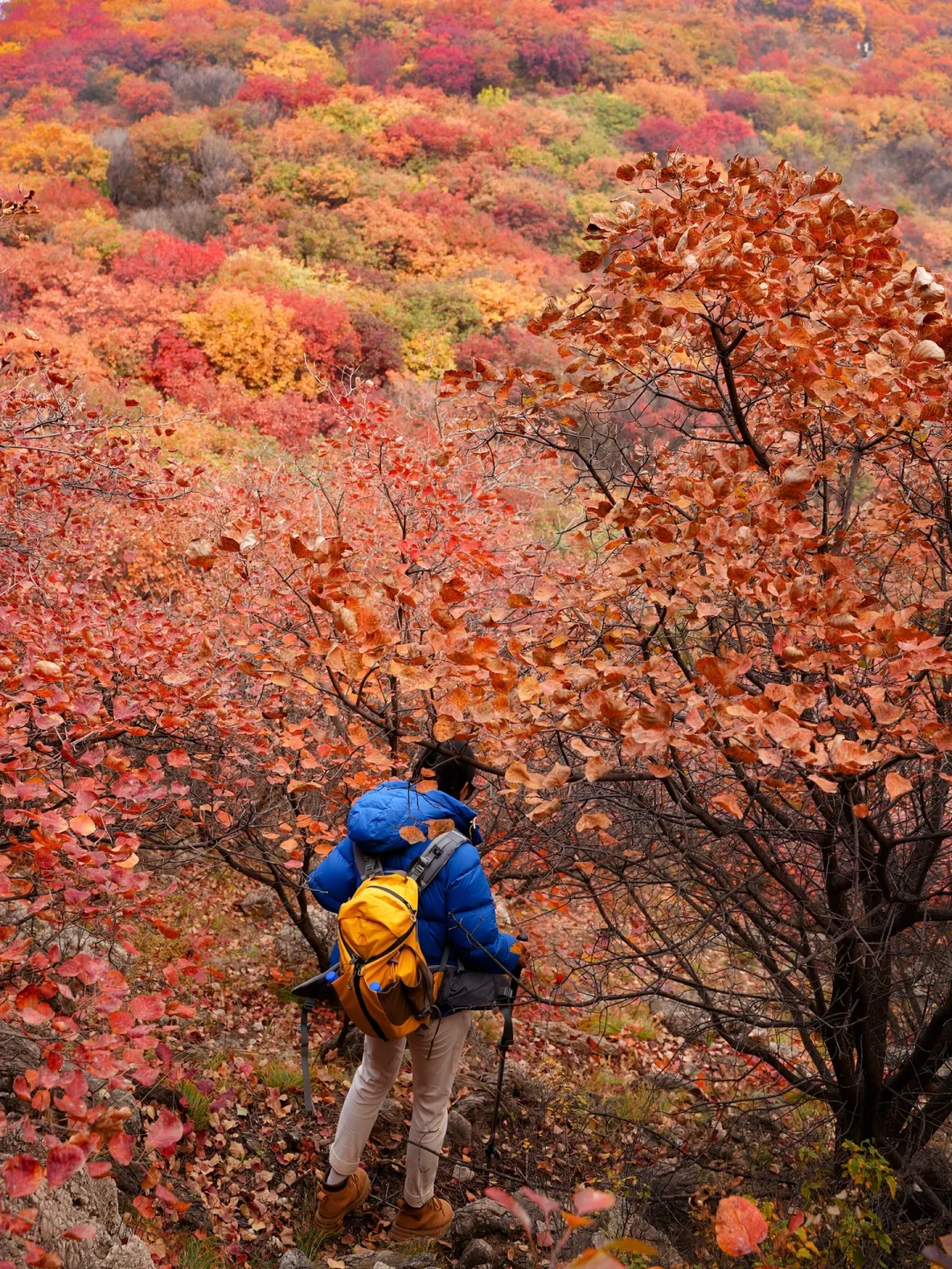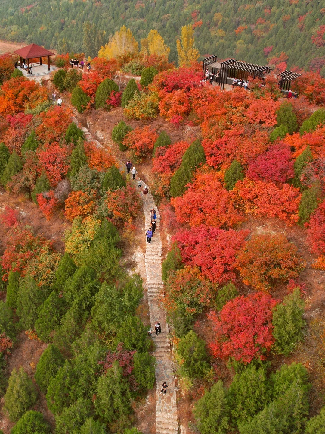 沿着步道走一路都是风景,🈵️山的红黄栌犹如秋日油画🖼️,真的非常震撼,走到图14这个口时,可以沿着右侧土路上去,不要怀疑,不会走错,这里的红叶非常漂亮,无人机航拍yyds,一定要到山顶,山顶风景拍照yyds