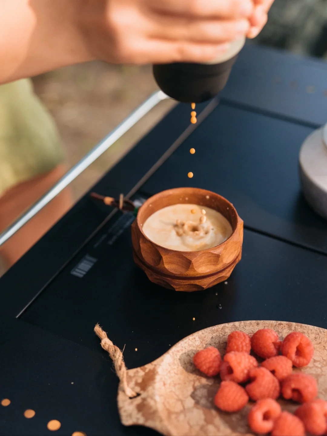 露营的时候我喜欢拍摄一些精致的小物品,有质感的灯、咖啡滴入杯子的瞬间、最好的食物,这些细节能让整体的图片更丰富也更有代入感。