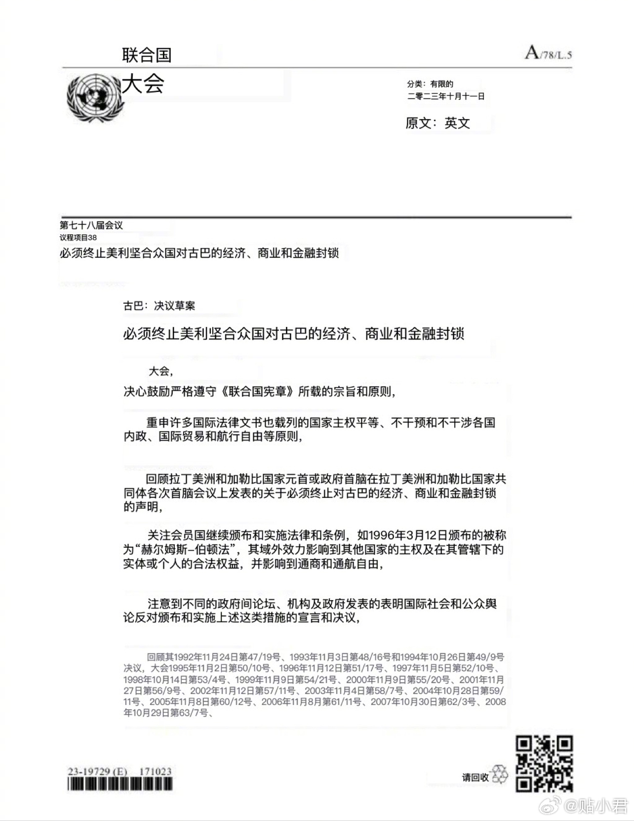 决议内容为:“必须终止美利坚合众国对古巴的经济、商业和金融封锁”。
