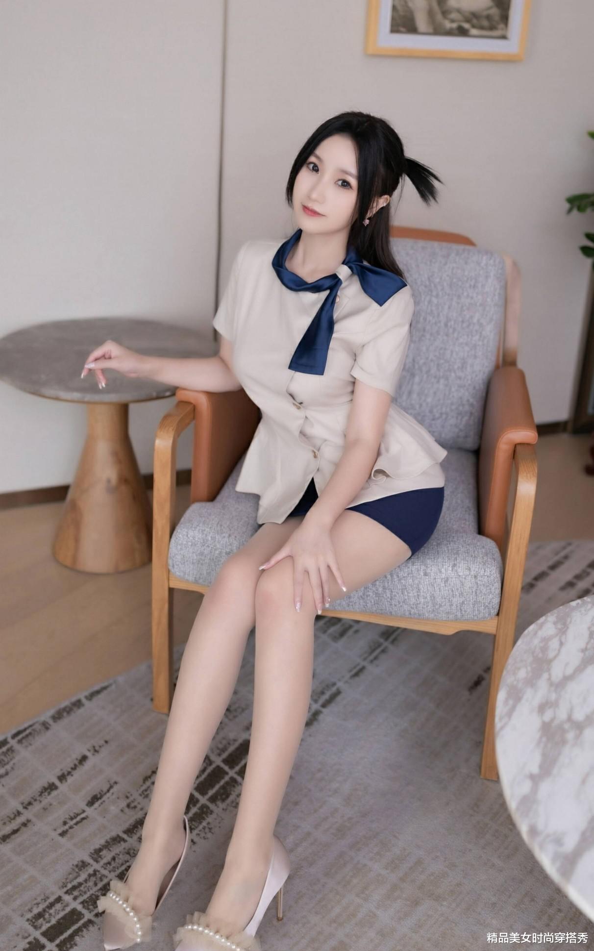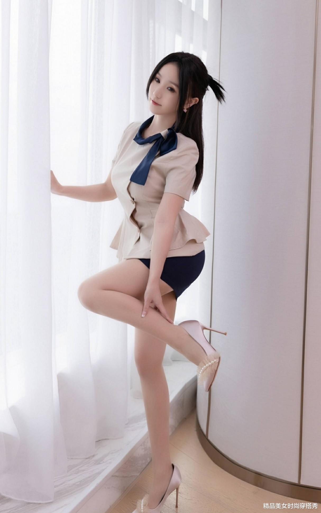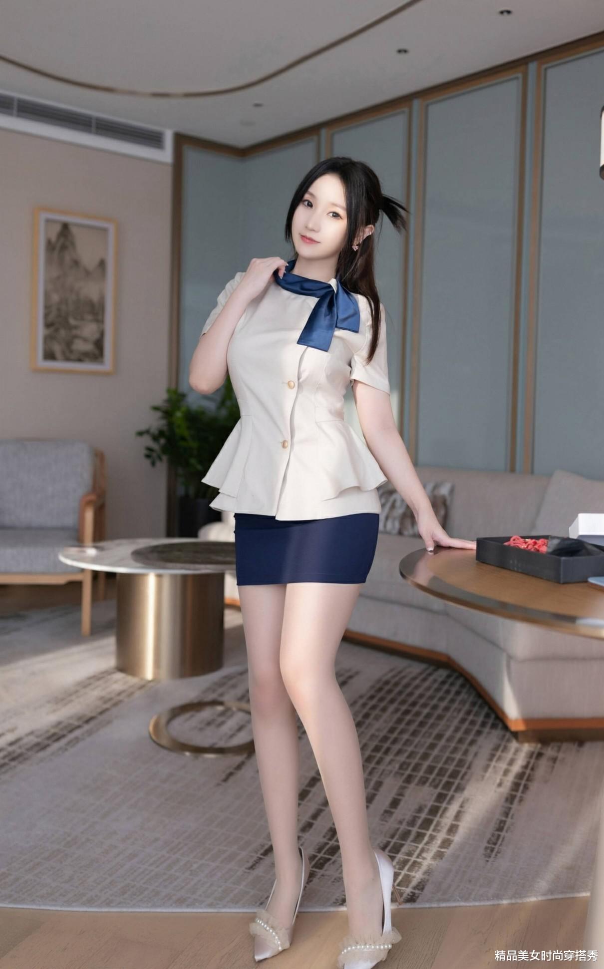 看这位小姐姐,一身空姐制服风格的穿搭,简直美出了新高度! 米色短袖衬衫,收腰设计巧妙勾勒出曼妙身姿,蓝色领结的点缀,更是增添了几分优雅与俏皮。深蓝色超短包臀裙,完美展现了她的臀部曲线,与衬衫的搭配相得益彰,既专业又不失时尚感。