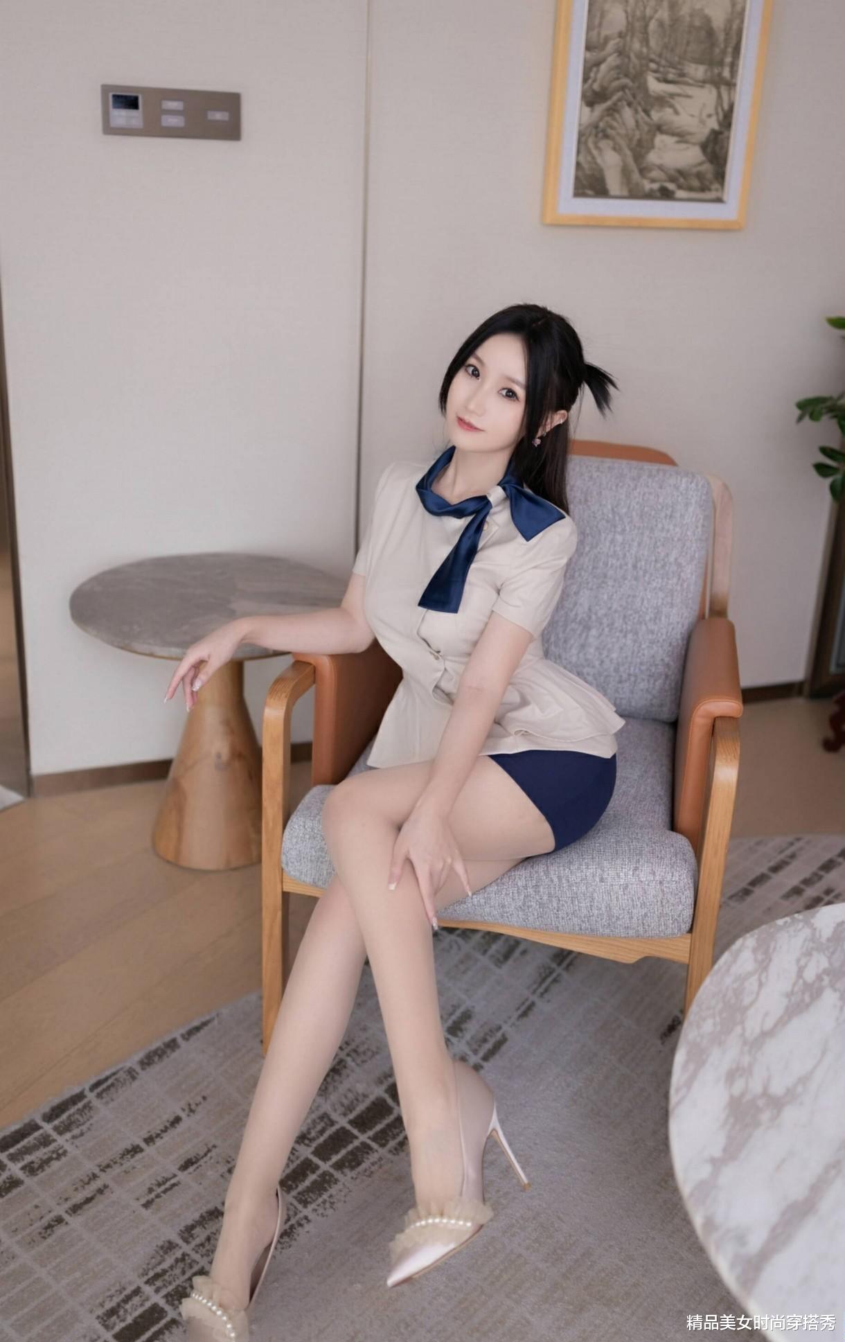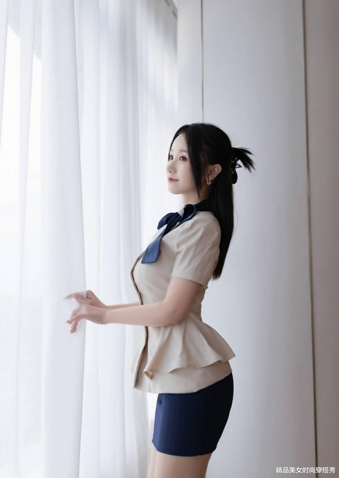 在不同的场景下,这套穿搭也展现出了不同的魅力。在酒店走廊,她端庄优雅,仿佛一位即将登机的空姐;在房间内,她坐在灰色椅子上,双腿交叉,手放在膝盖上,显得温婉可人;站在窗边,她轻轻拉开窗帘,侧身而立,仿佛在眺望远方,又增添了几分文艺气息。