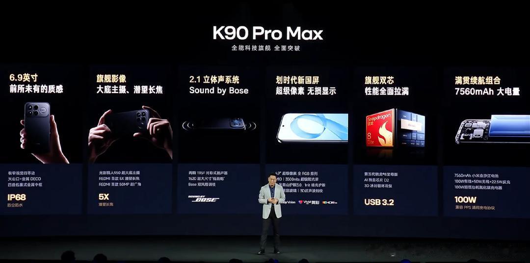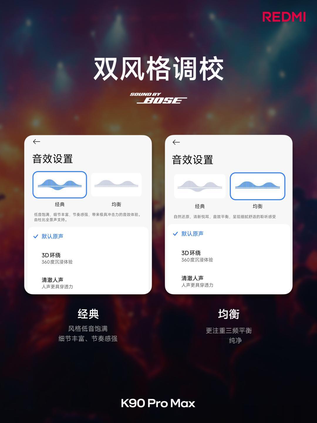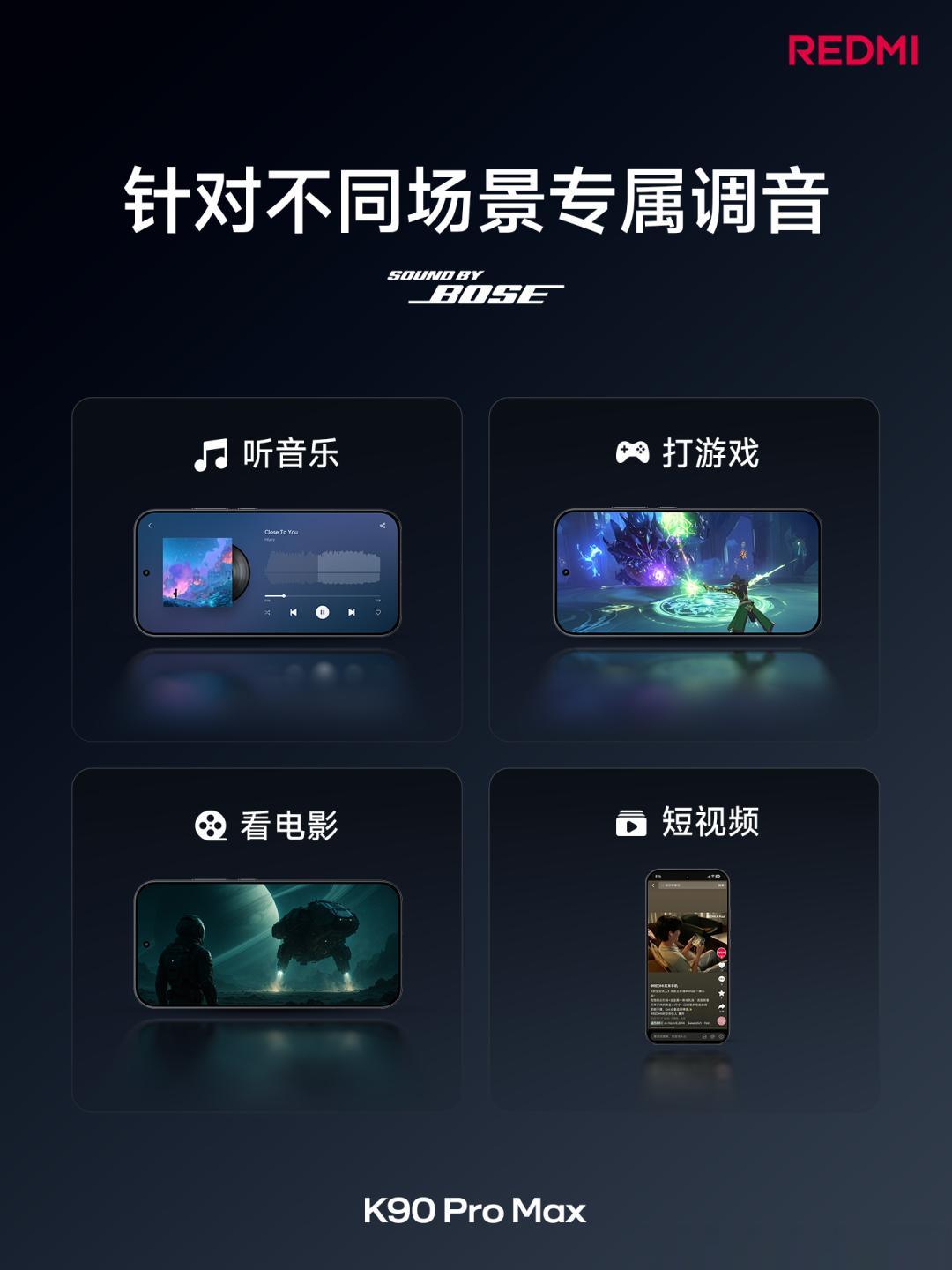 Bose 作为全球范围音频专业领先品牌,以其在小型化设备上的卓越声音表现而闻名。在本次合作中,Bose 深度参与共建,双方共同为 REDMI K90 Pro Max 打造了豪华三扬声器声学系统,并通过全链路 2.1 声道的构建,突破手机紧凑设计的限制,让足以重现现场演出临场感与情感张力的高品质低音,首次来到手机这样的移动音频设备,为用户带来了具备典型Bose风格的,低音饱满、细节丰富、人声清晰,且具备沉浸式声场的移动音频全新体验。