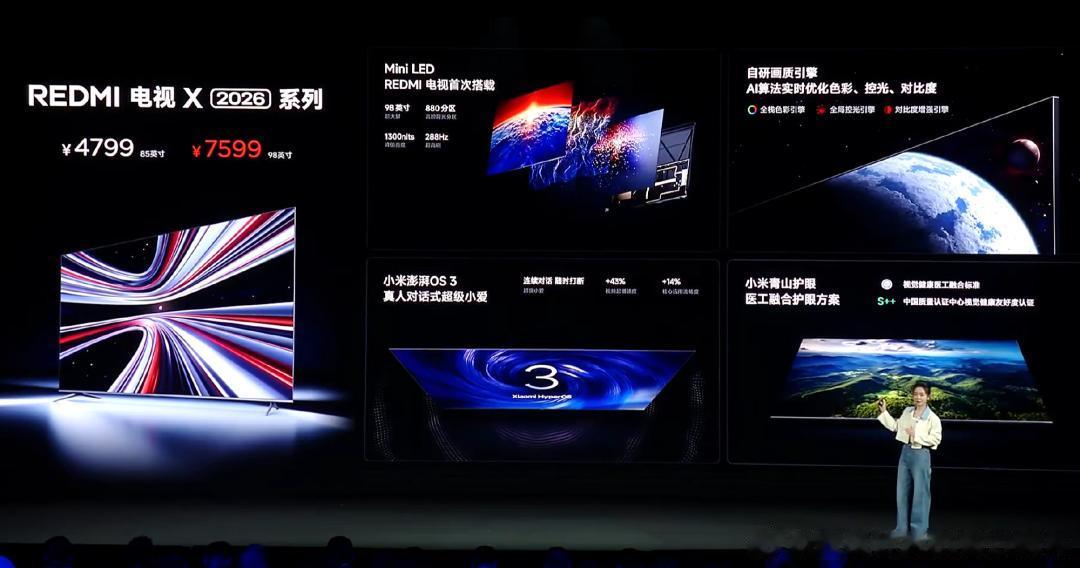 配置体验大幅升级REDMI电视 X 2026 焕新登场10月23日举行的新品发布会上,多款小米智能生态产品同台亮相,为“人车家全生态”中的“家”带来更丰富的选择。REDMI 电视 X 2026 98寸全新上市。作为REDMI电视的最新产品,全面升级的MiniLED背光、小米澎湃OS 3以及自研画质引擎让REDMI 电视 X在性能和体验上都得到了大幅升级。