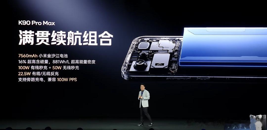 7560mAh小米金沙江电池满贯充电体验K90 Pro Max 内置 7560mAh 的小米金沙江电池,实现 881 Wh/L 超高能量密度。支持 100W有线快充、50W无线快充和 22.5W有线/无线反向充电。K90 则配备了 7100mAh 大电池与100W有线快充。两者均兼容100W PPS通用快充协议,充电便利性极大提升。