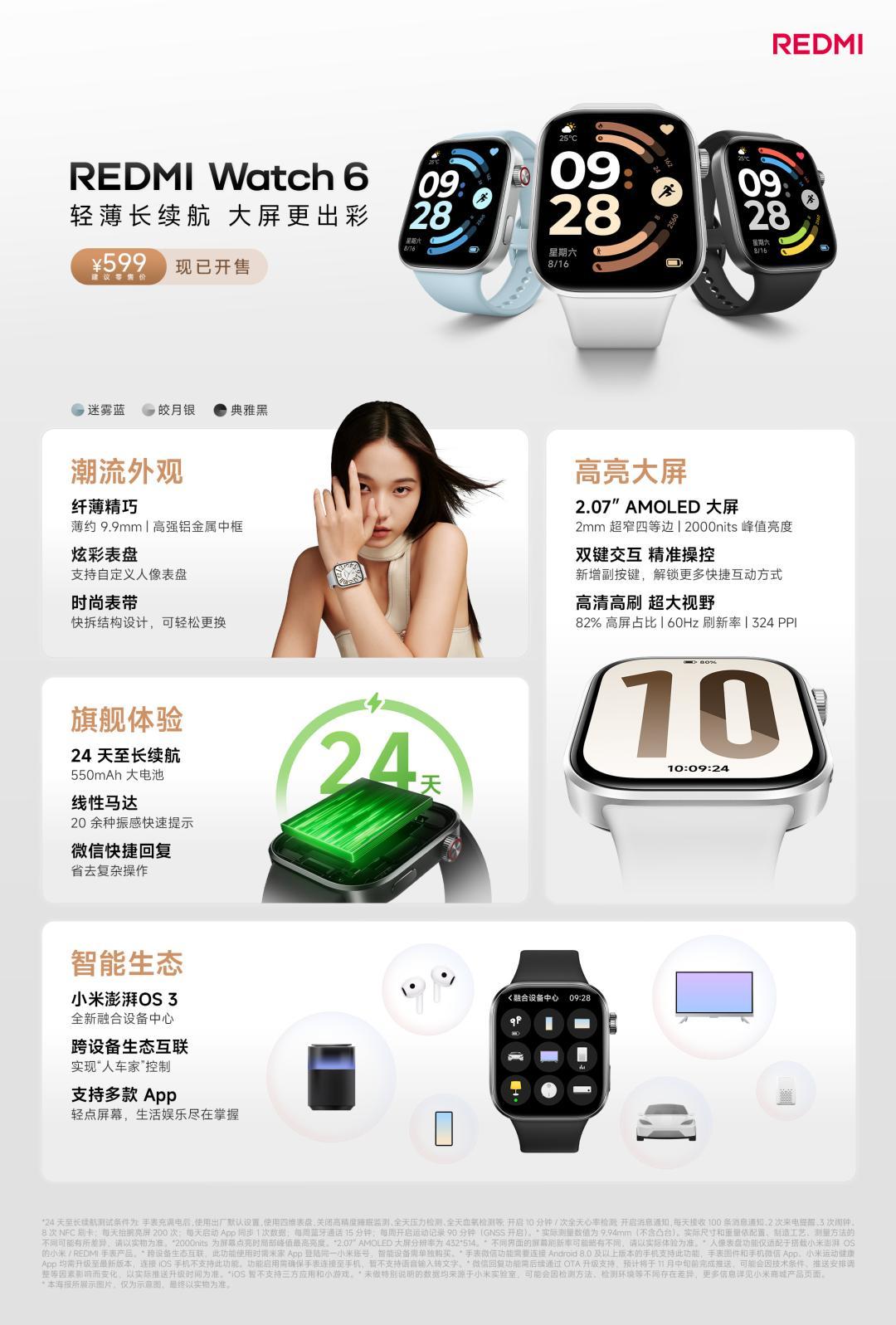 续航方面,550mAh大电池带来至长24天超长续航,常规使用可达12天。全新小米澎湃OS 3实现表端控车、米家互联、小米超级岛,支持SU7/YU7等多款NFC车钥匙,以及表端微信消息收发与回复。支持心率、血氧、睡眠、压力、女性健康管理,内置呼吸训练功能,结合专业指导与细腻振感,助力身心放松。支持150+运动模式,5ATM防水,GNSS独立定位,双L1天线精准导航,全面满足运动与日常使用需求。REDMI Watch 6,以旗舰配置与智能交互,开启健康时尚新生活,售价 599 元,发布会后正式开售。
