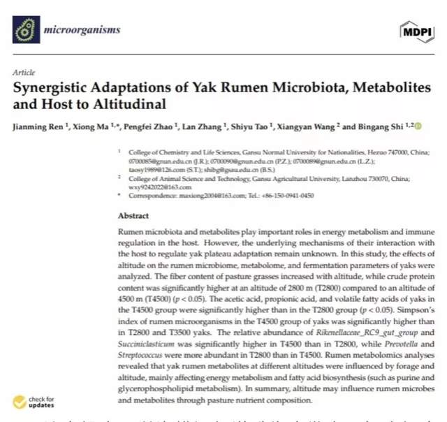 近日,甘肃民族师范学院化学与生命科学学院教师任建明在国际期刊《Microorganisms》(IF=4.5,中国国家科学院二区)发表题为 “Synergistic Adaptations of Yak Rumen Microbiota, Metabolites and Host to Altitudinal”的学术论文。该期刊在微生物学领域具有较高影响力,此次论文发表充分展现了甘肃民族师范学院青年教师的科研能力和学校在微生物学研究领域的实力,也为学校科研工作的发展注入了新动力。