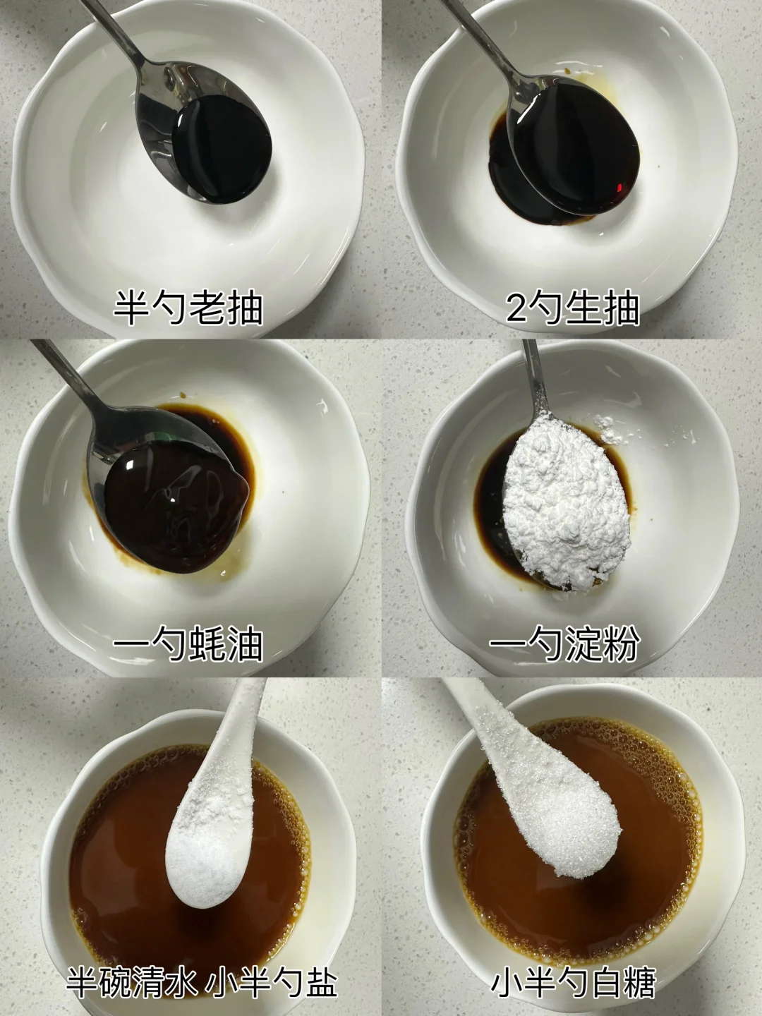 2️⃣调酱汁:半勺老抽+2勺生抽+一勺蚝油+一勺淀粉+小半勺盐+小半勺白糖+半碗清水,搅拌均匀,备用