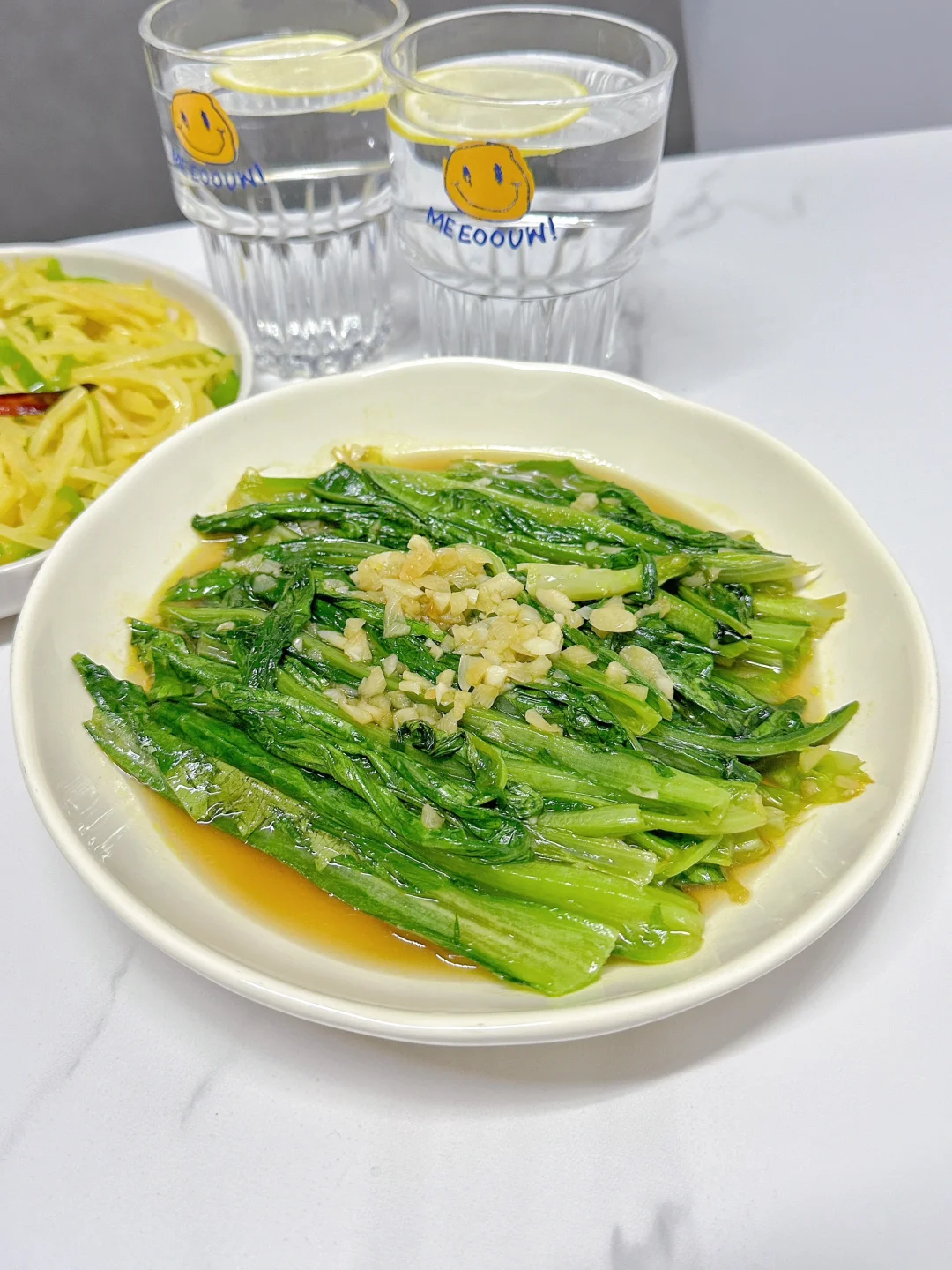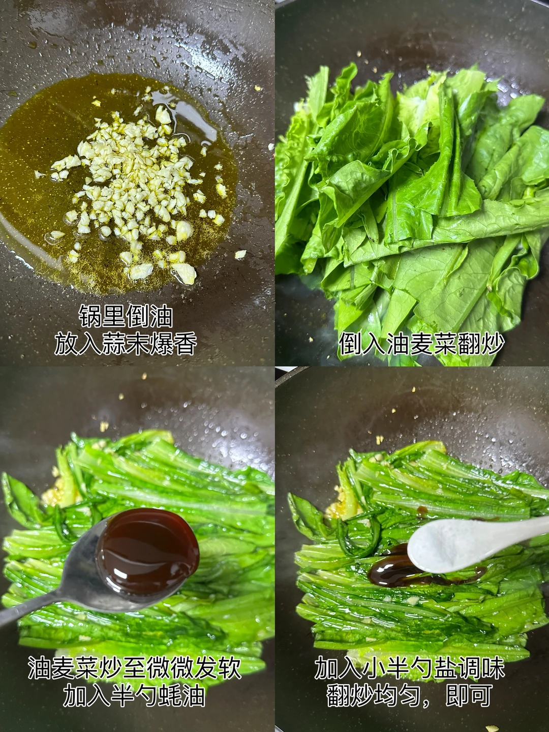 1️⃣锅里倒油,放入蒜末爆香,倒入油麦菜翻炒