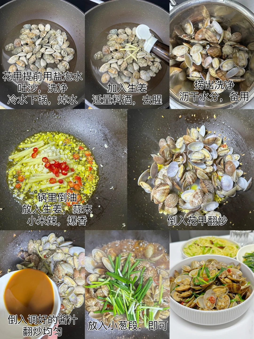 1️⃣花甲提前用盐泡水2个小时,吐沙,洗净,冷水下锅,放入生姜和料酒去腥,焯水,捞出,再次洗净,沥干水分,