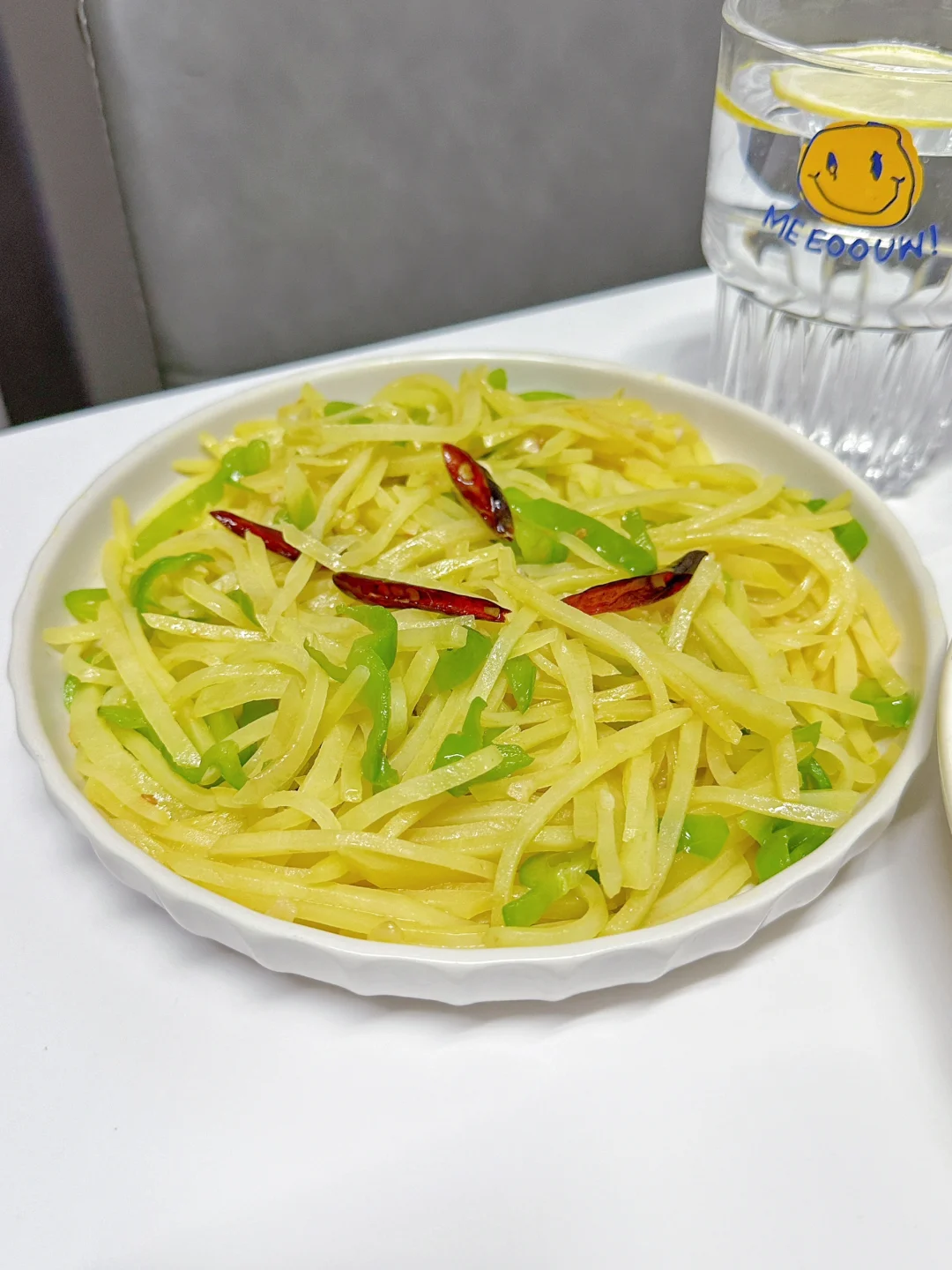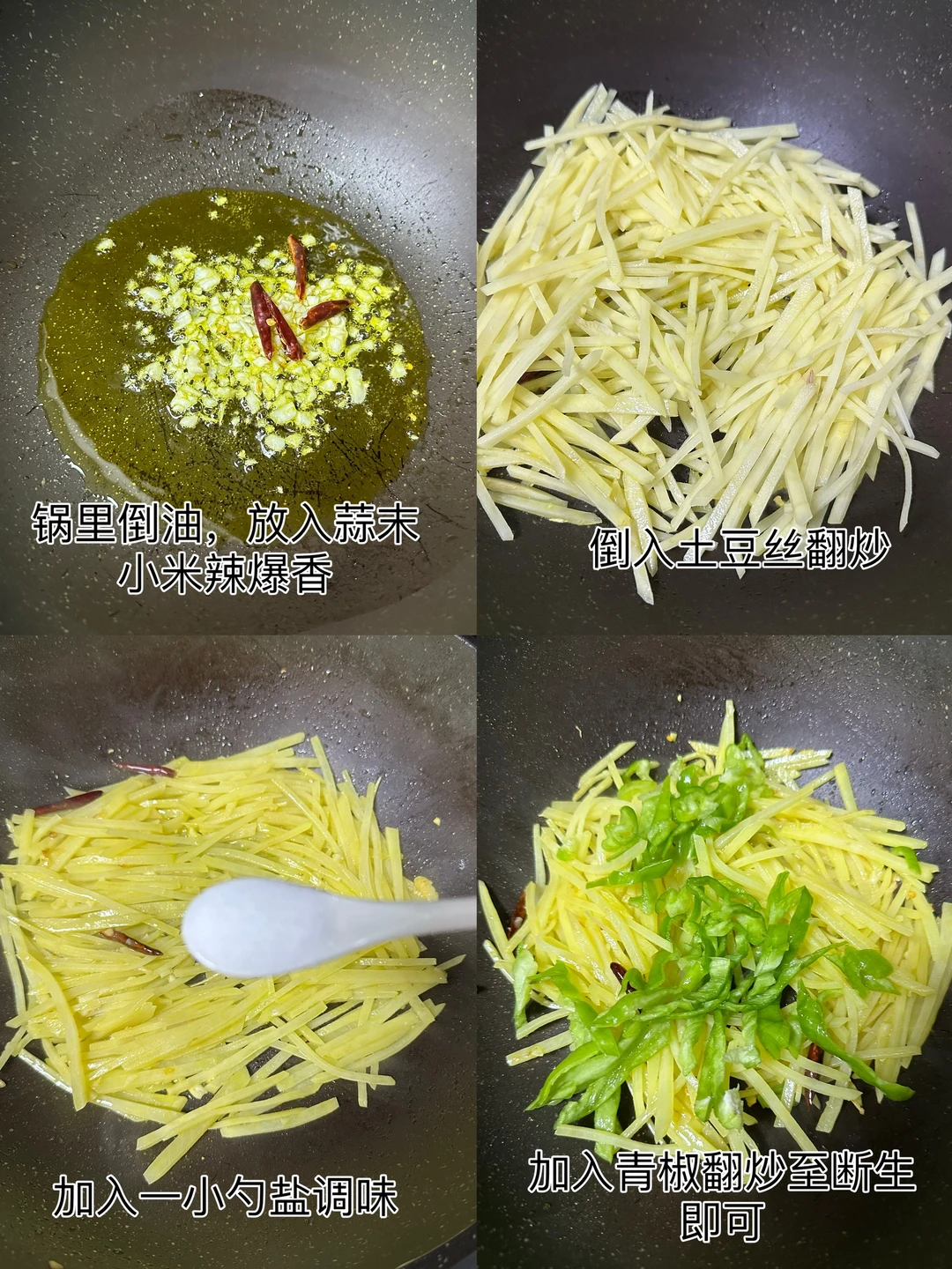 1️⃣锅里倒油,放入蒜末,干辣椒,爆香,倒入土豆丝翻炒,加入一小勺盐调味