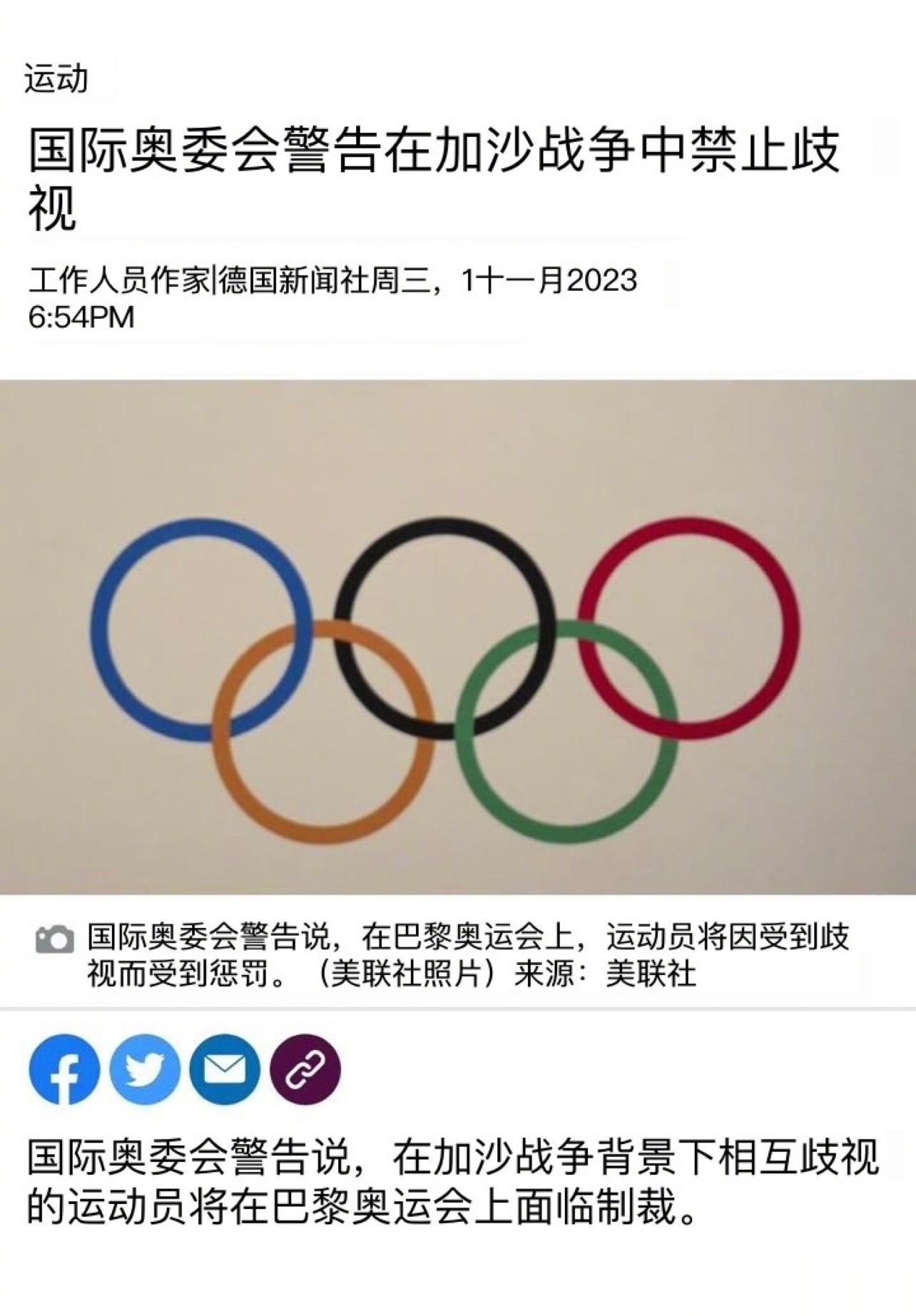 国际奥委会警告:在加沙战争背景下,以色列运动员不应为以色列政府行为负责。如果歧视会面临制裁。