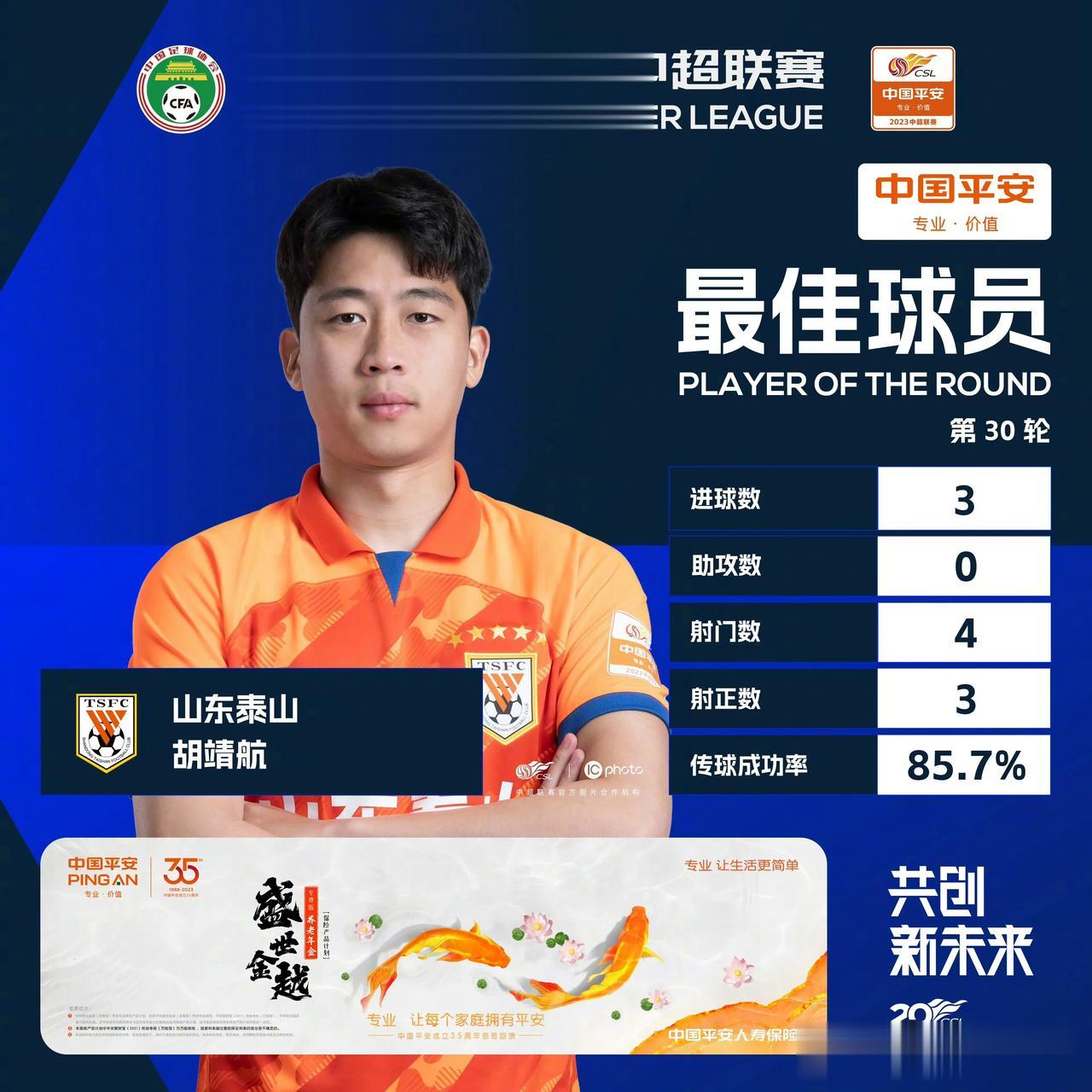 山东泰山队胡靖航被评为第30轮最佳球员!胡靖航在第三十轮对阵河南队的比赛中首次赛
