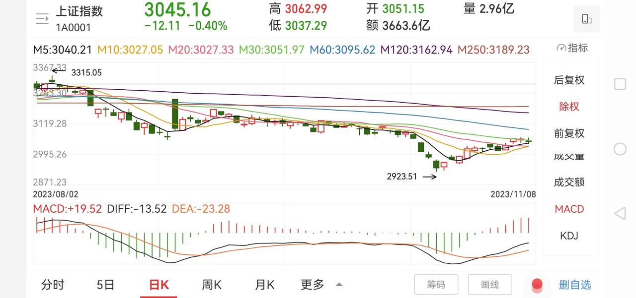 放量不涨是隐患! 今天两市成交量继续放量,全天大概10500亿,显示市场交投活跃。北向资金今天又出现净流出46亿,压制了市场炒作情绪。短线上证指数来到套牢区下方,短期观察能否突破,如果失守5日均线,短线还是考虑减仓为宜。 中证白酒最近表现一般,从那天茅台涨价放出巨量后就一直缩量,说明资金炒作意愿不强,短线还是谨防向下调整。中证医疗近期有磨底走势,尽管外围集采,依然表现强势,看8890能否突破。半导体今天表现不错,连续四天小红线,这一波看涨到0.950附近。恒生科技今天调整,在未跌破5日均线时不宜看空。创业板短线有回踩下方5日均线和之前跳空缺口需要,确认支撑强度。