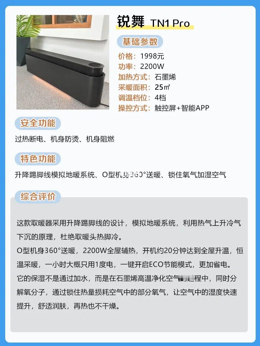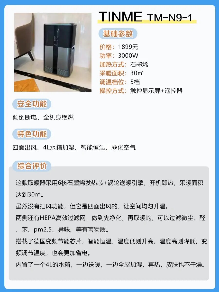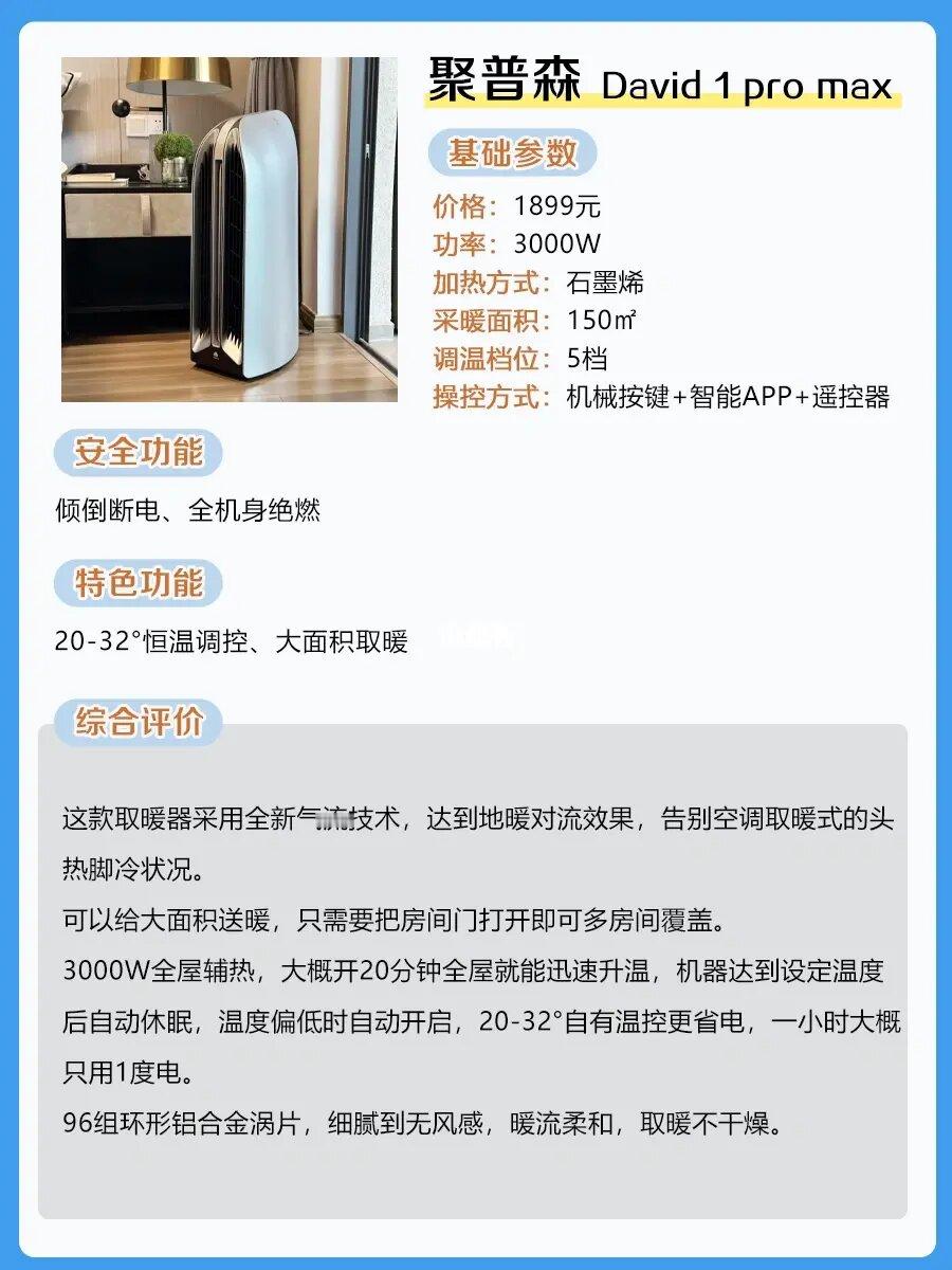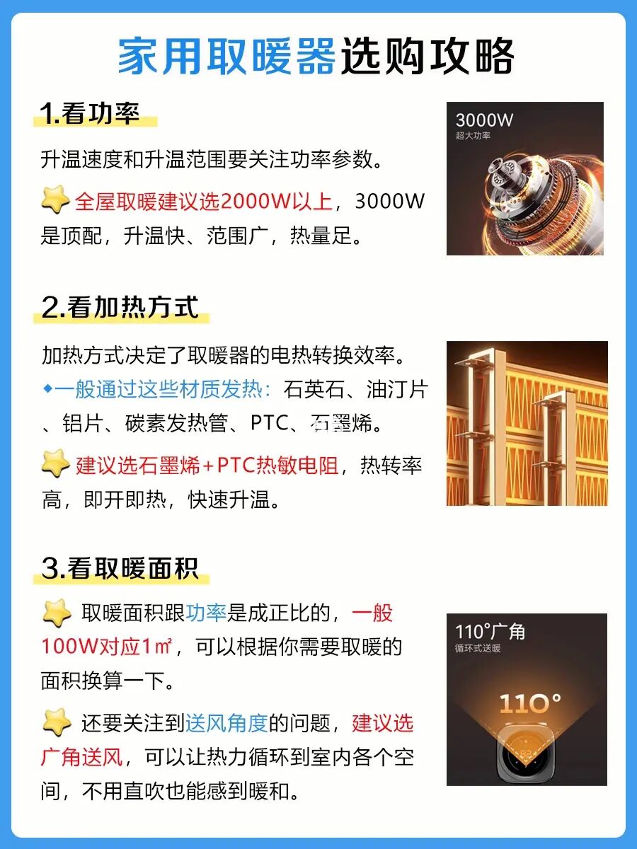 📝全屋取暖建议选2000W以上,3000W是顶配,升温快、范围广,热量足。