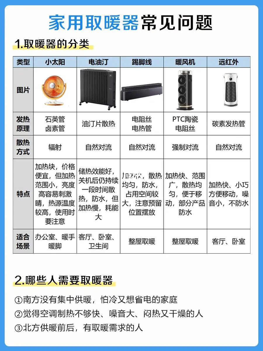 1️⃣取暖器的分类:小太阳、电油汀、踢脚线、暖风机、远红外,具体特点和使用空间看图2