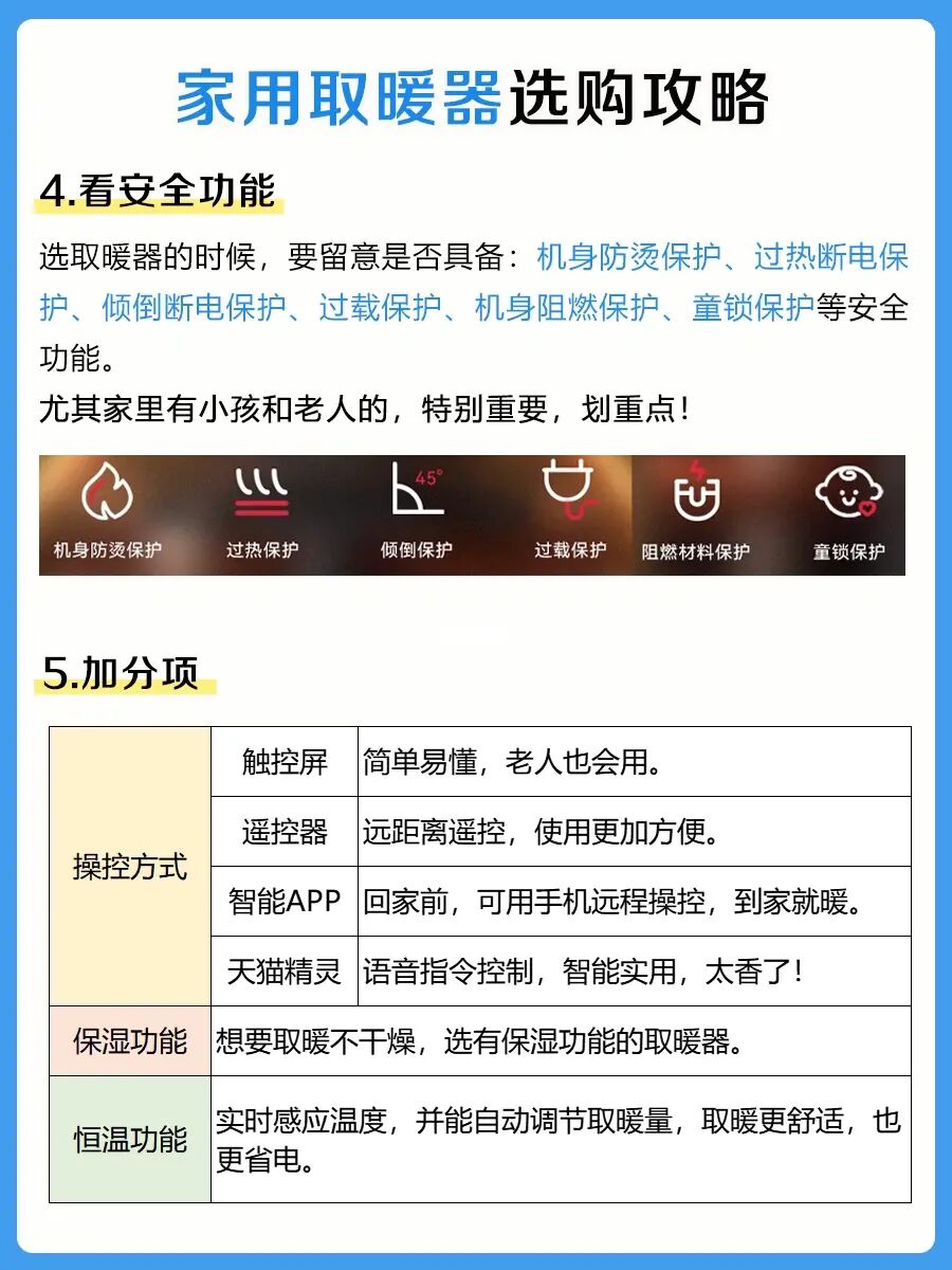 选取暖器的时候,要留意是否具备:机身防烫保护、过热断电保护、倾倒断电保护、过载保护、机身阻燃保护、童锁保护等安全功能。尤其家里有小孩和老人的,特别重要,划重点‼️