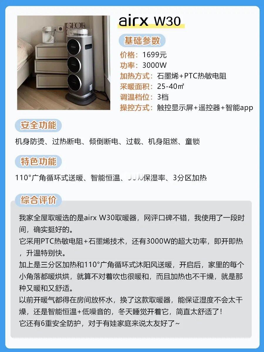 ✨我家全屋取暖选的是airx W30取暖器,网评口碑不错,我使用了一段时间,确实挺好的。