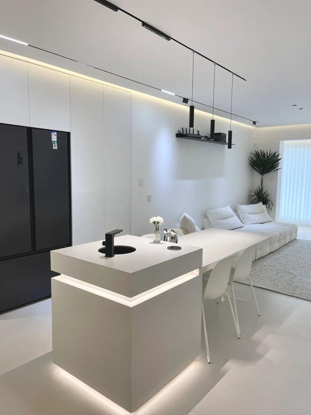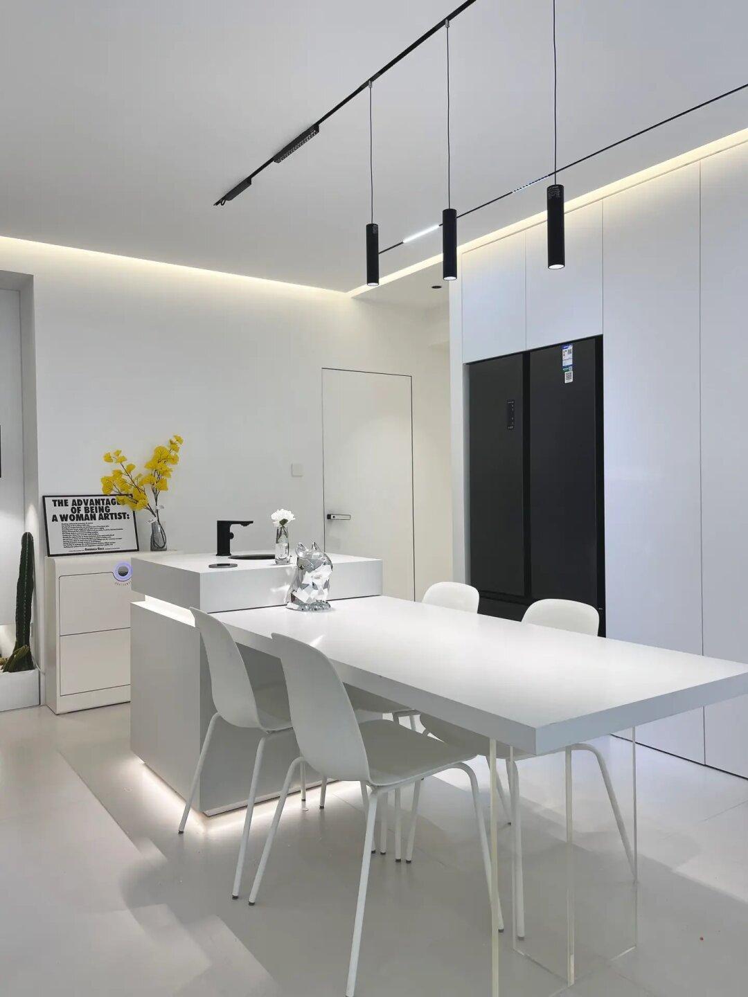 餐厅长度2.4米,两侧都做了餐边柜,中间没做传统餐桌,做了带上下水的纯白岛台