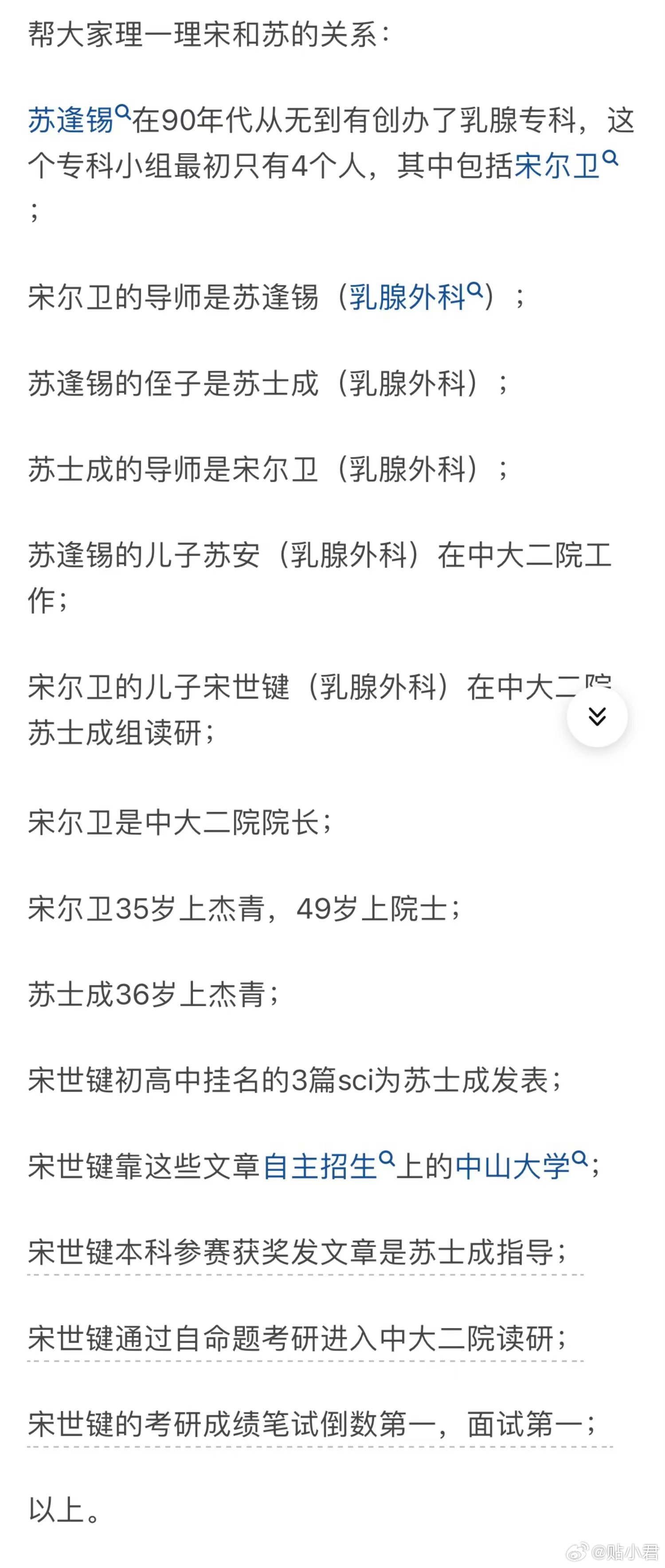 4、网上总结了苏和宋的关系:这个中山大学致癌课题组的导师苏士成,曾经的老师是宋尔卫院士。在苏士成的帮助下,宋尔卫院士的儿子在高中发表了3篇SCI(苏士成作为通讯作者指导老师),这儿子凭借高中时期的学术成果进入苏士成所在的中山大学医学院,又在苏士成指导下在全国大学生基础医学创新大赛上拿奖。