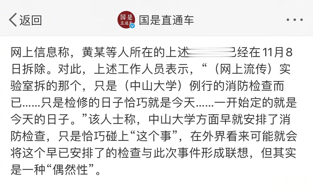 2、针对网上传出“实验室已经在11月8日拆除”。工作人员表示:“实验室拆的那个,只是(中山大学)例行的消防检查而已……只是检修的日子恰巧就是今天…(2-4)