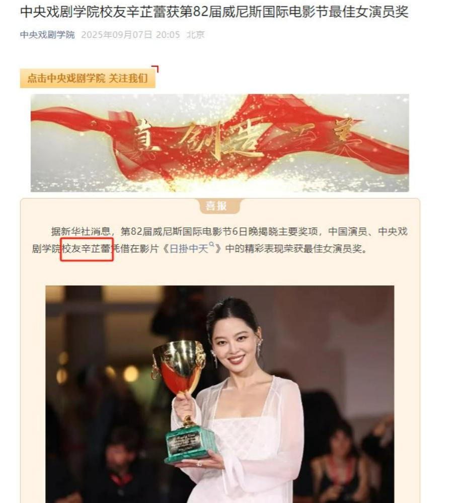 而就在这时,中戏也很给面子的在官网祝贺“校友辛芷蕾”赢得威尼斯电影节影后,算是帮助辛芷蕾平息了这场风波,承认了辛芷蕾的校友身份。