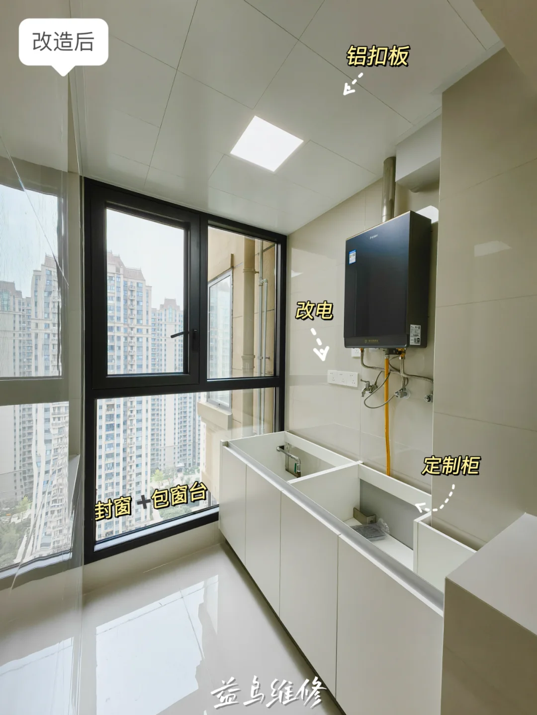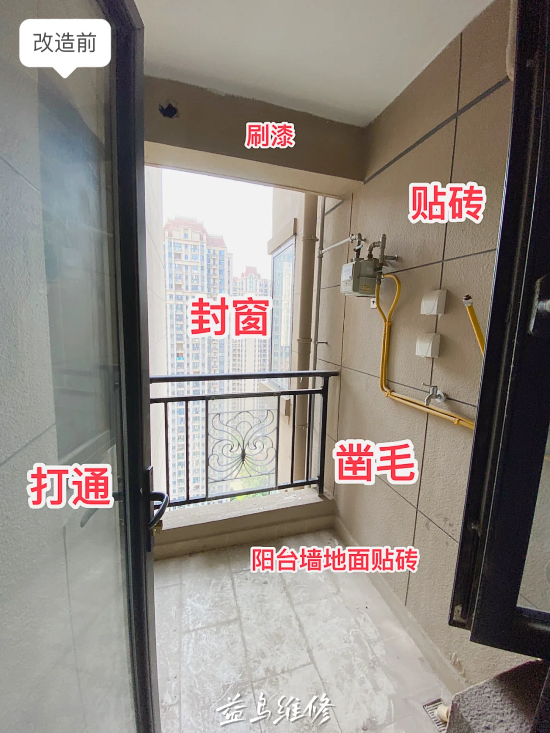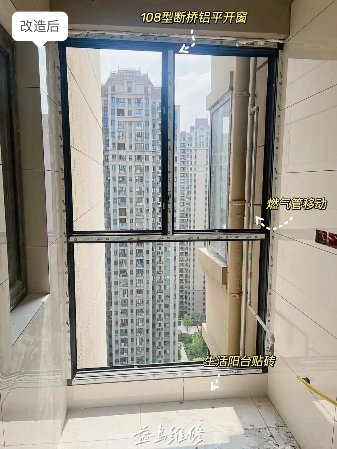 ⑤生活阳台封窗(玻璃需要给燃气管道开孔),贴砖前完成即可