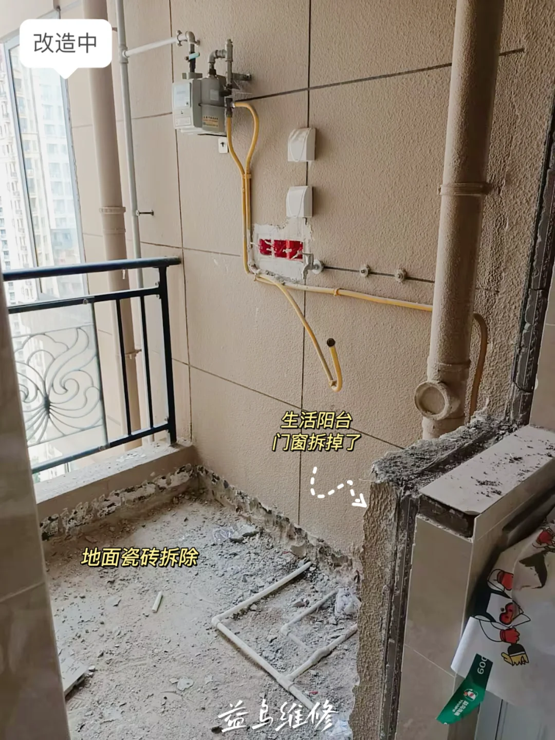 ③拆阳台地面瓷砖+墙面凿毛,便于后期贴砖更牢固