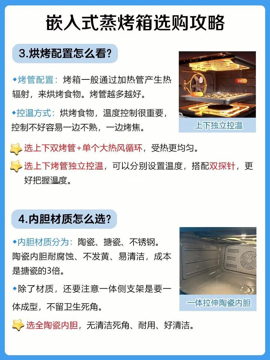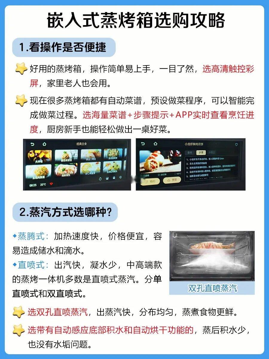 😎嵌入式蒸烤一体机真的是厨房必备的幸福感家电!它集蒸、烤、炸于一体,多功能省空间,一台就能满足多种烹饪需求,而且能与橱柜完美贴合,让厨房颜值蹭蹭长! 😫但是市面上的蒸烤箱品牌那么多,很多小伙伴都说不会选~ 📝下面给大家整理了详细的选购攻略,搞清楚以下6️⃣点再入手避免踩坑哦! ✨1、看操作是否便捷 ✨2、蒸汽方式选哪种? ✨3、烘烤配置怎么看? ✨4、内胆材质怎么选? ✨5、看安全防护 ✨6、看品牌和保修 👉🏻详细的讲解可以参考图片,欢迎有不同问题的小伙伴随时提问~