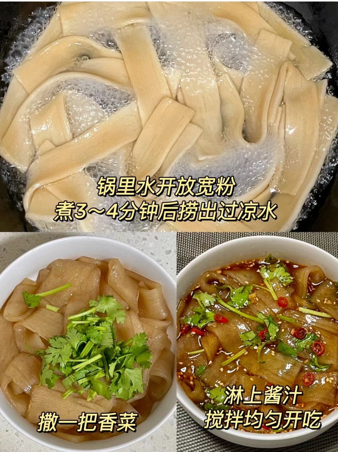 现在该处理宽粉咯。烧一大锅开水,水开之后把宽粉轻轻地放进去。煮宽粉的时候要注意哦,时不时搅拌一下,防止它们粘在一起。不同品牌的宽粉煮熟的时间不太一样,一般煮个 3-5分钟左右,您可以夹一根尝尝,要是感觉软硬度刚好,不夹生,那就说明煮好啦。煮好的宽粉捞出来,放到提前准备好的凉开水里过一下,这样宽粉吃起来会更加劲道爽滑。